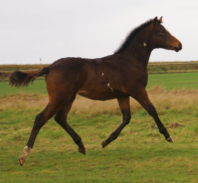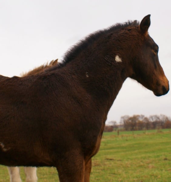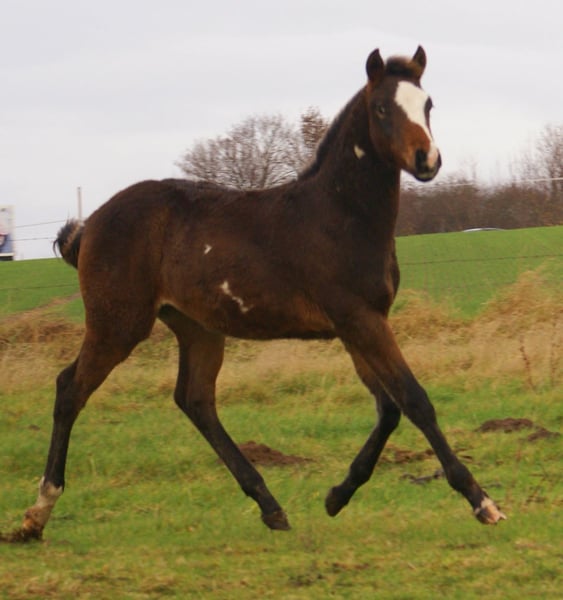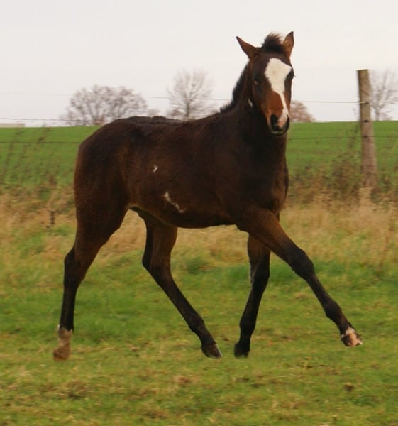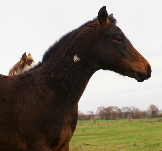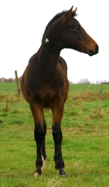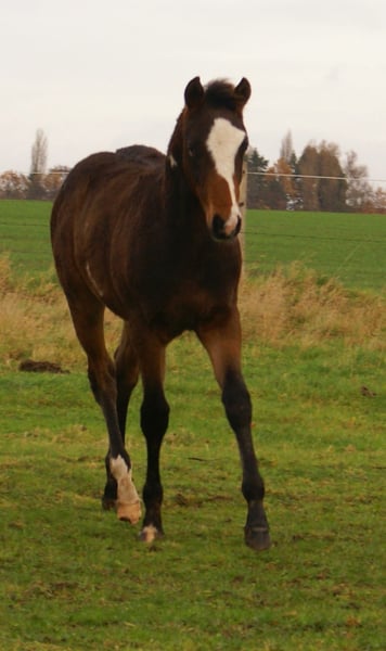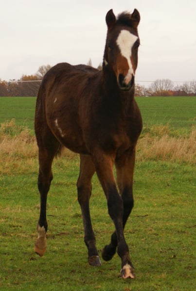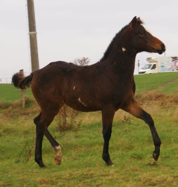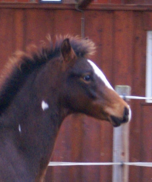 Charming Quarter Pony colt, dark bay with spots, sire: Paint Horse Kingsley n Jills Wood, dam: German Riding Pony by Kennedy WE. The foal comes with full papers and a passport from ZSSE. Raised alongside other foals, this friendly little heartbreaker features a distinctive blaze and a heart-shaped mark on its neck. Light-footed with expressive, large movements.