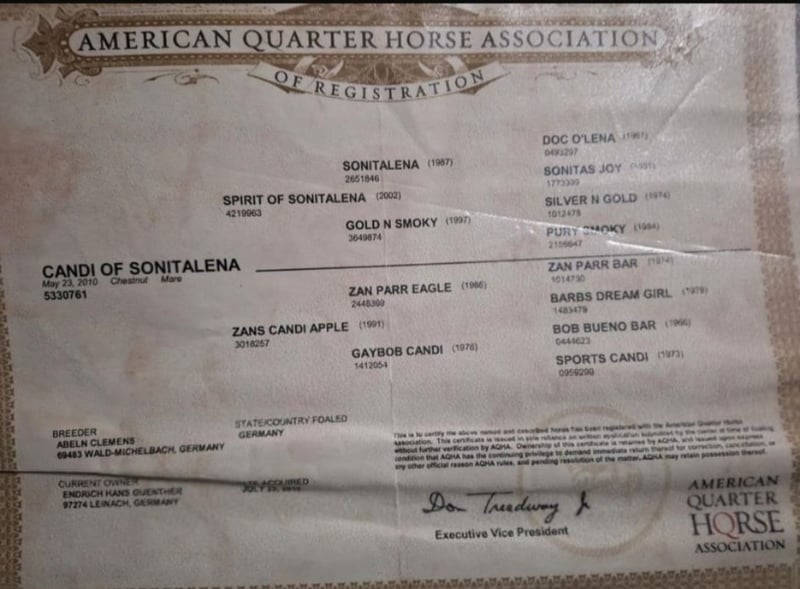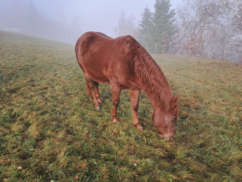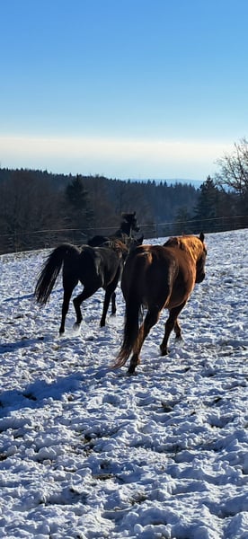 Wij zoeken voor onze zeer rustige, vriendelijke Quarter hengst een begripvol nieuw thuis. Goldi, zoals wij de knappe noemen, is 5,5 jaar oud, ongeveer 1,48 m hoog, met een prachtige roodgouden kleur. Hij is nog niet bereden, maar kent het alleen wandelen met de mens en is daarbij zeer energiek. Hij laat zich door niets van de wijs brengen, ongeacht wat er langs de weg staat, ligt of beweegt. Goldi is al eens ingezet als dekhengst en is altijd handelbaar. Momenteel loopt hij samen met een merrie en een ruin op de wei; hij is zeer tolerant. Waarom wij Goldi verder plaatsen? Hij en ik vinden elkaar helaas niet. Ik heb het gevoel dat hij meer een mannendier is. Goldi woont in een open stal, en dat moet ook in zijn nieuwe thuis zo blijven; hij heeft veel ruimte nodig om tevreden te zijn. Hij heeft ook wat temperament, wat je ziet wanneer hij met de andere paarden over de weilanden galoppeert, met zijn hoofd in de wind en de staart over de rug. Goldi woont in het mooie Zuid-Schwarzwald. Voor meer informatie, evenals aanvullende foto's en video's, staan wij graag telefonisch voor u klaar. Een persoonlijk gesprek vinden wij belangrijk. En denk er alstublieft aan of u een stal hebt en de financiële middelen voor een paard. Hartelijke groeten en een gezegende, vreugdevolle kerstperiode.