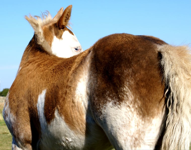 In auffälliger chestnut overo Optik präsentiert sich dieses Hengstfohlen mit 2 blauen Augen, Vater: Paint, Mutter: Deutsches Reitpony, das Fohlen hat volle Papiere, wüchsig, fröhlich, besonders