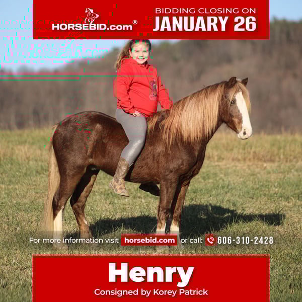 𝐉𝐀𝐍𝐔𝐀𝐑𝐘 ⭐️𝑨𝒍𝒍 𝑺𝒕𝒂𝒓 𝑳𝒊𝒏𝒆𝒖𝒑⭐️ Happening now thru MONDAY | JANUARY 26th - Available EXCLUSIVELY on HorseBid's website! For more details and to register visit: www.Horsebid.com CONSIGNOR CONTACT: Korey Patrick 606-310-2428 LOCATION: Brodhead, KY BREED: Quarter Pony REGISTERED: No REGISTERED NAME: Henry COLOR: Red Roan HEIGHT: 12 AGE: 10 GENDER: Gelding Maybe if Santa Claus didn't find what he was looking for??? It's your lucky day.... King Henry is standing around 12h, he is 10 years old, a beautiful red chestnut roan, Gelding and if you are looking for a horse that will bring countless smiles, miles of memories and nothing but good times in the saddle… then Henry is the guy that you have been looking for. He has been one of our 7-year-old's favorite ride all summer long, and he has been tested over and over again, passing with flying colors every time! This guy loves attention and likes to be pampered! From braids to baths, he loves his time with his kids! He is totally gentle for the kids to ride and will go anywhere that they ask him to go whether that be alone or with a group. Henry never raises a fuss!! Henry is a phenomenal trail horse and covers any terrain. He has been ridden up/down steep slopes, across creeks, ditches, deadfall, rough rocky areas… you name it, and he can handle it. He rides with confidence, will go out alone, will ride in the front or back of the group and leaves the barn with no issues. He is traffic safe and has been ridden through town. He lopes nice circles, has a good stop and is easy to operate. He has been ridden around the ranch and through the cows. Henry has had a rope throw off of him and has tracked the roping dummy just for fun while the kids rope. Henry the horse that will get your kids set on the right path with confidence, will keep that smile on their faces and they will enjoy him for years to come! For more info call Korey Patrick 606-310-2428 with any questions or to make a buy it now offer. We can get transportation arranged to anywhere in the US. Located in Brodhead, KY.