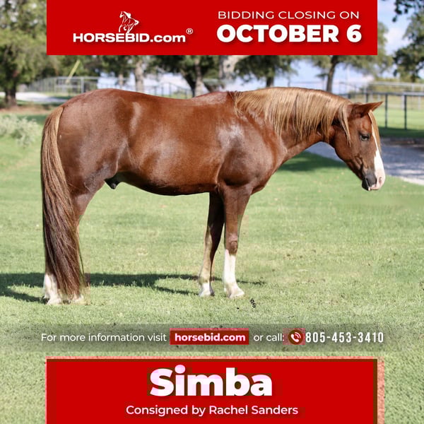 🍂 𝓐𝓾𝓽𝓾𝓶𝓷 𝑨𝑳𝑳 𝑺𝑻𝑨𝑹 𝑳𝑰𝑵𝑬𝑼𝑷 🍂 Happening now thru MONDAY | OCTOBER 6th - Available EXCLUSIVELY on HorseBid's website! For more details and to register visit: www.Horsebid.com CONSIGNOR CONTACT: Rachel Sanders 805-453-3410 LOCATION: Decatur TX BREED: Quarter Pony REGISTERED: No COLOR: Sorrel HEIGHT: 13 AGE: 10 GENDER: Gelding If you’re looking for your next astonishing kids pony, you’ve come to the right place! Meet Simba! Simba is the pony of all children’s dreams! He is sure to wow everyone he comes in contact with. Simba is a 10 year old pony gelding. He stands at the perfect height of 13 hands. He has a calm and marvelous demeanor, with the looks to back it up! Beautiful deep sorrel color with a flaxen mane and tail making him stand out! This marvelous gelding is the best addition to any family home. He has been used for just about anything you could think of! He is extremely gentle a truly is a “unicorn.” He is an absolute angel on any trail you may take him on. He will gladly walk through or over fallen branches, ditches, water, and treacherous terrain. He will willing comply with going anywhere you point his nose. He is completely safe to ride out alone on or with a group of other horses. Don’t let his size fool you, his heart and personality is the size of Texas! Simba absolutely loves drinking sweet tea and will ask you to share your snacks with him. He is determined to please anyone that swings a leg over on him. He will ensure the safety of his rider at all times. Simba is not only fabulous out on the trails but also breathtaking in the arena. He will walk, trot, and lope in both directions effortlessly. Simba rides like a big horse! Simba is a finished jumper and soars over everything you point him at with ease. Simba has dabbled in the play day events and has a big enough motor to be super competitive with some time. He is truly broke making him super easy to operate! He moves off your legs and is super soft in the bridle. He will perform to the best of his ability at everything you ask of him. He is super easy to catch, and greets you anytime he sees you coming! He is good with other horses or livestock as well. You can put shoes on him or leave him barefoot, the preference is up to you. Don’t miss out on this once in a lifetime opportunity! For more information or if you would like to set up an appointment to come try Simba please call Rachel @ 805-453-3410