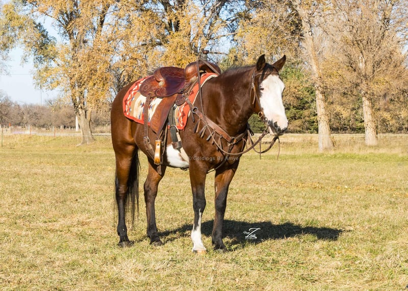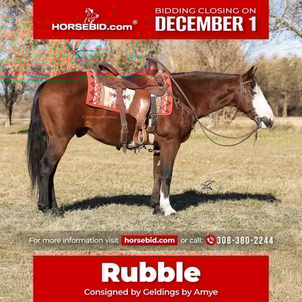 ⚜️ 𝓽𝓱𝓮 𝐇𝐨𝐫𝐬𝐞𝐦𝐚𝐧'𝐬 𝓢𝓱𝓸𝔀𝓬𝓪𝓼𝓮⚜️ Happening now thru MONDAY | DECEMBER 1st - Available EXCLUSIVELY on HorseBid's website! For more details and to register visit: www.Horsebid.com CONSIGNOR CONTACT: Geldings by Amye 308-380-2244 LOCATION: Grand Island, NE BREED: Tobiano Quarter Pony REGISTERED: No REGISTERED NAME: Rubble COLOR: Bay Tobiano HEIGHT: 13.3 AGE: 10 GENDER: Gelding Rubble, Rubble, on the Double! If you have small grand kids, this will make perfect sense to you! My grandson dubbed this mighty little horse “Rubble” after the endearing, brown and white pup of the same name on the Paw Patrol movie. Rubble the pony is short, stout and very fun to ride. He stands 13.3 hands with thick boned, correct legs and good hard hooves. He has a go forth and conquer disposition when being ridden in rugged terrain and makes an excellent lead horse. Rubble is just as content to ease along in the middle of the trail ride group if you wish to socialize. Or if you prefer the solitude of bringing up the rear, Rubble has no need to keep up with the herd unless you ask him to . Rubble is more comfortable on the trail than in the arena, but if circles make you happy, he will try his best. Random trail obstacles like bridges, logs, flags, roping the dummy, blue tarps and other such silliness do not faze him a bit. Rubble is ten years old. Just old enough to have been there and done that – but still young enough to explore beautiful country with his person for years to come. He would be the perfect choice for a small woman or intermediate youth rider. He is easy to lead, load and tie and is good for the farrier. Right now, Rubble has shoes on because he has been trail riding in rugged, rocky country in the past few weeks. His splashy white face and tall front stocking make him eye-catching in any crowd. He is a handsome boy and a really fun horse to ride. If he speaks to your heart, please call me! I would love to visit with you about him further. My number is 308-380-2244. Better yet, if you are able to, come and meet him and ride him for yourself!