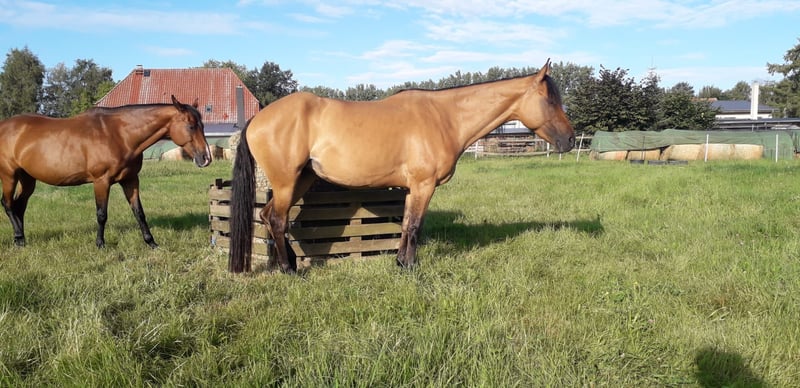 Quarterpony mare, geboren in 2018, 156 cm, droomkleur vos, ZSSE paspoort, regelmatig gevaccineerd en onder behandeling bij de tandarts, hoefsmid en laad- en losplek is bang voor nieuwe situaties. Arya heeft een degelijke basisopleiding gekregen, zowel vanaf de grond als onder het westernzadel. Ze houdt van vrijheidsdressuur en lange buitenritten. Ze is zeker in het terrein, zowel alleen als in een groep. Wel heeft ze wat vertrouwen nodig van de ruiter in het terrein. Momenteel wordt ze bereden door een moeder en een 12-jarig kind. Ze kent kinderen in het algemeen, maar is geen puur beginnerspaard; ze heeft iemand nodig die haar af en toe geruststelt, anders kan ze wat onrustig worden. Ze wil altijd gefallen en iedereen tevredenstellen. Ze heeft goede basisgangen, kent longeerlijn, leidlijnwerk, trail en natuurlijke hindernissen op de grond, evenals vrijheidsdressuur. Onder het zadel is ze western gereden, kent de basis en trail. Vanwege tijdsgebrek is ze vooral in het terrein bereden. We hebben ook lessen gevolgd en ze één keer op een concours laten zien. Arya staat momenteel in een open stal, was in elke kudde gemiddeld hoog in rang en goed sociaal. Ze kent boxenstallen, maar daar kan ze niet goed mee overweg op de lange termijn. Een weekend is geen probleem. Haar voederbehoefte is vrij laag; ze neemt niet snel toe in gewicht, zelfs niet op 24 uur wei. Daarom heeft ze in de winter zeker ruwvoer ad libitum nodig. Ik zoek voor mijn kleine vriendin een 5-sterren thuis, met mensen die tijd voor haar willen nemen. Bij voorkeur gevorderde recreatieruiters. Ik zie haar niet in de pure wedstrijdsport, omdat ze daar niet zoveel plezier aan had. Ze doet alles wel, maar haar plezier ligt vooral bij buitenritten, trail en vrijheidsdressuur. Afstamming: Vader: Jo Buckskins Son (AQH), door Buckskin Dear, inmiddels 29 jaar en nog solide in het terrein als recreatiepaard bij de eigenaar. Moeder: Ravanna Sweet Fay (QP), uit Prince CL Buckley merrie (AQH) x onbekend. Tot LK1A EWU gereden, allround succesvol, vooral in trail. Met Arya geef ik haar zadel, pad, bit, peesbeschermers, poetsmateriaal, halster en dekens mee. Huidige locatie is 30900 Wedemark. Arya wordt aangeboden vanaf voorjaar 2026, omdat ze tot die tijd beschikbaar blijft.