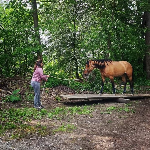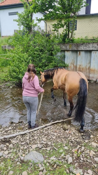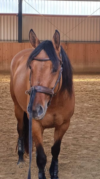Quarter pony mare, *2018, 156cm, dream color Dun, ZSSE passport, regularly vaccinated and has been to the dentist, farrier and is loading well. Arya has received a solid basic training from the ground and under the Western saddle. She loves free work and long rides. She is safe in the terrain alone or in a group, but needs some reassurance from the rider in the field. She is currently being ridden by a mother and her 12-year-old child. She is generally familiar with children. However, she is not a pure beginner's horse; she needs someone who can provide her with security from time to time, otherwise, she can become a bit hectic. She always wants to please and make everyone happy. She has excellent basic gaits, is familiar with lunging, long line work, trail and natural trail obstacles on the ground, as well as free work. Under saddle, she is ridden Western, knows the basics and trail. However, due to time constraints, she has been ridden more in the terrain. We have also attended courses and presented her at a competition once. Arya is currently in an open stable, has been in every herd at a medium rank and is well-compatible. She also knows box housing, but does not cope well with it over a longer period. A weekend is not a problem, though. Feeding requirements: she is rather hard to keep. She does not gain much weight even with 24-hour pasture access. Therefore, she definitely needs ad libitum hay in winter. I am looking for a 5-star home for her, as I simply do not have enough time for her. Ideally, with leisure riders who want to take time for her. I do not see her in pure competition sports, as she did not have much fun there. Although she participates, she has always enjoyed more trail riding, trail and free work. Pedigree: Father: Jo Buckskins Son (AQH) by Buckskin Dear Now 29 years old and still solidly functioning as a leisure horse with the owner in the terrain. Mother: Ravanna Sweet Fay (QP) from Prince CL Buckley mare (AQH) x Unknown Ridden up to LK1A EWU all-around successfully, especially in trail. With Arya, I would include her saddle, pad, bridle, boots, grooming kit, halter, and blankets. Current location is 30900 Wedemark. Arya will be available for rehoming in spring 2026, as she will still be available until then.