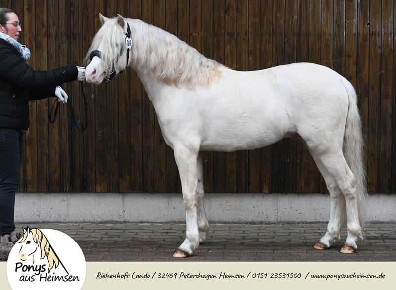 Riehenhofs Lando - Ponys aus Heimsen Mit enormen Bewegungspotential ausgestattet, überzeugte Lando in allen Belangen und wurde als Prämienhengst und Reservesieger der Körung in Redefin auf dem Endring herausgestellt. Auf der Hengstkeistungsprüfung in Offenbüttel stellte er seine herausragenden Fahreigenschaften unter Beweis, und wurde mit einer sagenhaften 8,85 Leistungshengst als Reservesieger. Er gibt seinen unverwechselbaren Welsh-Typ und freundliches Wesen sicher an seine Nachkommen weiter - und das in Sonderfarbe! Seine Arbeitseinstellung und Gutmütigkeit in der täglichen Arbeit, vorm Wagen und unter dem Sattel machen das Training mit ihm zu einer wahren Freude und sind das aller wichtigste für eine nervenstarke und leistungsbereite Pony-Nachzucht. Landos Fohlen überzeugen mit Ihrem einwandfreien Charakter, Ausdrucksstärke und enormer Trabmechanik, die wunderbare Kinder-, Fahr- und Freizeitpferde für die ganze Familie sind - Ponys für alle Fälle und das große Viereck! Seine ersten beiden Fohlenjahrgänge waren hoch erfolgreiche Prämien- und Siegerfohlen und überzeugten auf ganzer Linie Richter, Züchter und Besitzer. Riehenhofs Lando stammt ab vom hoch erfolgreichen Prämien- und Leistungshengst Woldberg‘s Leonardi, der 2023 bei der FN-Bundeshengstschau auf der Grünen Woche in Berlin zum Bundes-Reservesieger im Schauwettbewerb der Welsh Ponys (Sektion B) gekürt wurde und die FN-Bundesprämie erhielt. Der Muttervater Timing, selbst ein Sohn des Vierspänner-Weltmeisters Tizian/Tobias Bücker, absolvierte seine HLP 2007 in Thüle mit 8,63 als Sieger, nahm dreimal an Weltmeisterschaften teil und verbuchte zahlreiche weitere internationale Siege und Platzierungen. Die Mutter Verb.Pr.St. Ella brachte noch die St.Pr.A. Riehenhofs Elba (v. Nilanthoeve‘s Zippo), die 2021 für die Elitestutenschau Weser-Ems in Hude-Wüsting zugelassen war und stellte jüngst den Körungssieger der Welsh B in Weser Ems. Überzeugt Euch von unserem tollen Hengst für Eure Zuchtstuten! - Anerkannt für Westfalen, Weser-Ems und Hannover - Farbe Cremello (Farbgentest: A/a, Cr/Cr, e/e) - CA-frei, PSSM-frei - Unterbringung der Gaststuten im Offenstall, Ausbildung und Beritt zeitgleich möglich www.ponysausheimsen.de 015123531500