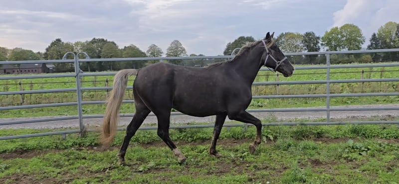 Star’s Silver Heron – Rocky Mountain Horse (RMHA) 7 Jahre alter, großer Rappe mit Silberapfelfarbe Zuchtbuchpapier der Rocky Mountain Horse Association (RMHA) Vater: EFM ROCKIN'ROCKET Farbe: Schwarz Mutter: MVF EASTER PARADE Farbe: Silberapfelschimmel Heron ist ein groß gewachsener, kräftig gebauter Wallach und misst ca. 1,58 m! Sein Charakter ist außergewöhnlich lieb und sanft, menschenbezogen und äußerst treu. Auf der Weide zeigt er alle vier Gänge, im Tölt ist er lateral, mit weiterer Ausbildung besteht viel Potenzial. Sein Vater, EFM Rockin’ Rocket, stammt von der Stute Pretty Woman ab, einer direkten Dock-Tochter, die in Amerika von J. Lee’s Rockit gedeckt wurde. Seine Mutter, MVF Easter Parade, gehört zu den wenigen Pferden in Europa, die die alten Mountain Pleasure Horse-Linien in sich tragen. Easter Parades Mutter, Bourbon Manhattan, ist eine Tochter des Mountain Pleasure Horse-Foundationshengstes Mountain Bourbon sowie der Foundation-Stute Fancy Lady Scarlet. Diese Linien sind in Europa und innerhalb des Rassekreises äußerst selten und sehr nah in der Abstammung verwandt. Heron kennt Bodenarbeit und ist eingeritten. Er hat die Zeit gebraucht, um vollständig heranzuwachsen, weshalb die Ausbildung nun wieder aufgenommen werden sollte. Er arbeitet gern mit und ist sehr lernwillig, er möchte gefallen. Wir suchen für ihn einen Reiter, der mit Gangpferden vertraut ist und ihn weiter ausbilden sowie schöne Ritte machen möchte. Er ist brav beim Hufschmied und wird regelmäßig beschlagen, macht regelmäßig eine jährliche Zahnkontrolle, ist regelmäßig entwurmt, seine Impfungen sind auf dem neuesten Stand, und beim Osteopathen ist er ebenfalls brav. Er kennt das Anhalten, liebt Putzen und Aufmerksamkeit. Er ist leicht auf den Trailer zu laden und läuft stets ordnungsgemäß an der Führleine mit. Heron verträgt keinen Staub, deshalb erhält er bei uns immer Vor-Droog-Hafer oder Heu. Feuchtes Heu kennt er ebenfalls und arbeitet gut damit. Im Frühjahr und Sommer trägt er stets einen Fliegendecke gegen die Insekten. Heron steht bei uns 24/7 draußen auf einer großen Paddock mit großem Unterstand und kommt täglich in die Weide. Das entspricht auch unserer Wunschvorstellung für ihn. Momentan läuft er mit unseren anderen Wallachen und einem Hengst auf der Weide, was problemlos funktioniert. Zuvor hat er auch einige Jahre in einer gemischten Herde mit Stuten verbracht. Der Verkaufspreis für Heron beträgt 12.000 Euro. Möchtest du diesen „großen, intensiven Schatz“, den du immer rufst, wenn er dich sieht oder hört, persönlich kennenlernen oder mehr Informationen erhalten? Dann kontaktiere uns gern über das Kontaktformular oder per E-Mail an jockeylin@planet.nl