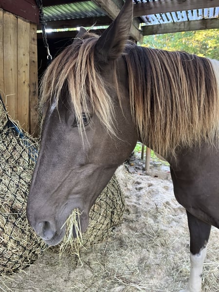 Beautiful and large Rocky mare for sale. She is registered as a Spotted Mountain Horse due to her special color. She is an absolute treasure. I can very well imagine her as a therapy horse after appropriate training. At the moment, she is still playful, as befits her age. She has been regularly dewormed, vaccinated, had her teeth done, treated osteopathically, and she is barefoot. She also loads onto the trailer without any problems. In 2023, she was with Cary Hardiman for 5 months for basic training (Western). Since then, we have mainly been out in the field and have done a lot of groundwork. She is very soft in the mouth, can be ridden well without a bit, and is incredibly comfortable to ride. I will only let her go to the very best hands. She is not used to box confinement and should therefore continue to be kept in an open stable with at least two other horses. This is not an urgent sale. A Deuber Jerez SKL (Bückeburger model) in size S2, specially fitted for her, can be purchased separately if interested. Also, a Spanish bridle. Both in black. Please write if interested.