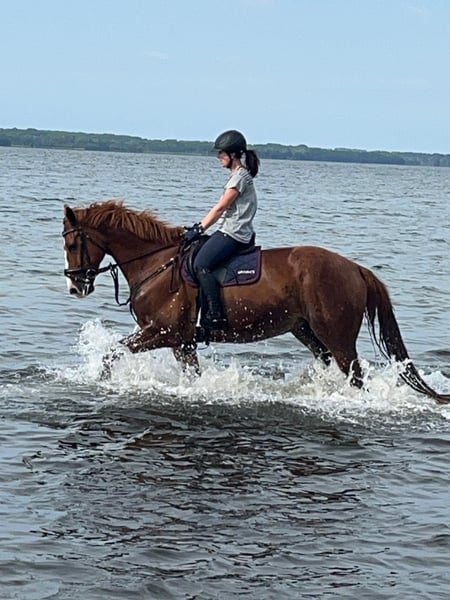 Wir verkaufen im Auftrag einen 11jährigen großrahmigen Fuchswallach welcher für alle Sparten offen ist. Daktari ist platziert in Dressurprüfungen der Kl.A, springt zuverlässig auch mit weniger erfahrenen Reitern einen Parcours ( Kl.A) und Geländesprünge, wurde dort aber nicht auf Turnieren vorgestellt. Sowohl im Voltigieren als auch in WBO Prüfungen konnte er sich bereits mit Kindern platzieren. Mit seiner Größe von ca 1,79m ist er vielleicht nicht unbedingt ausschließlich für Kinder geeignet. Natürlich ist er schmiedefromm, verladesicher (Anhänger/Lkw), sehr sozial im Herdenverband und gesund. Eine ca. 2 Jahre alte AKU ist vorhanden.