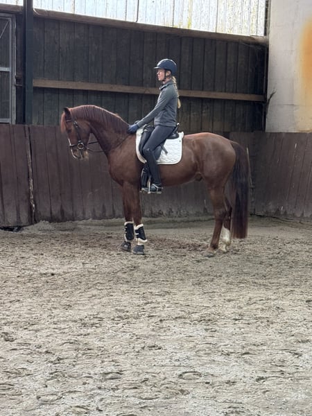 My little Fred is looking for a new home. I bred him myself from a Carry Gold mare. His sire is Feinrich. He is a very handsome chestnut gelding, now six years old, and already confidently jumping flying changes. He learns very quickly and always strives to do everything right. He has an excellent work ethic and a very charming personality. He is very people-oriented and loves attention. Apart from dressage work, he is also familiar with double longeing, and we have taken him out to jump free several times. He shows great talent in this area. Since he carries jumping bloodlines on his dam’s side, I believe he could also be successful in show jumping. He is regularly dewormed and vaccinated, and is farrier- and loading-friendly. He grew up in a herd and is accustomed to box stalls as well as daily turnout on paddock or pasture. Videos can be sent upon request via WhatsApp.