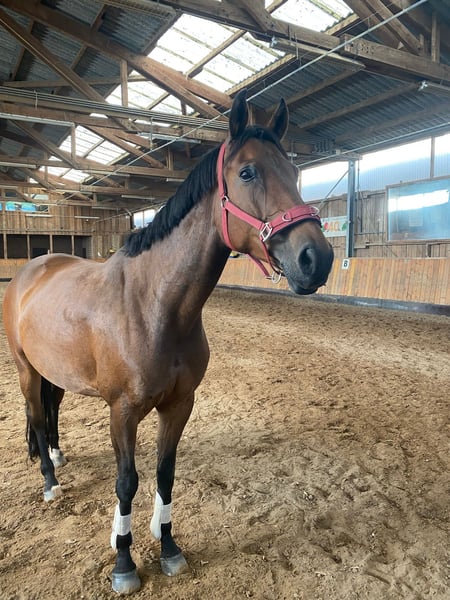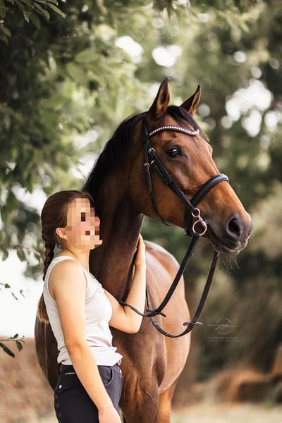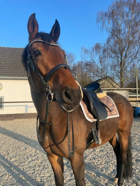 I would like to find a loving home for my 12-year-old Rhinelander mare named Roxy. I bought Roxy directly from the breeder in 2020. We have experienced a lot together, and now I hope to find someone who will cherish her as much as I have. Roxy is a horse with great basic gaits and a strong motivation to work with her rider. She has a healthy go—bucking, rearing, or running off are not her things. By the way, she is also very affectionate! In dressage, she has been trained up to level A, and she has already jumped A courses with the breeder. However, this has not been pursued further. Roxy prefers to go out in the field with a horse buddy, confidently leading the way and always showing reliability. Otherwise, we have tried a lot together: dressage, free jumping, groundwork, circus lessons, walking, and pole work. Roxy enjoys being in a herd and as much time outside as possible—that makes her happy! Under saddle, Roxy likes clear guidance—so she is not a pure beginner's horse. She is well-behaved when loading but also needs someone who can give her clear leadership. Unfortunately, due to a private accident, I can no longer ride pain-free and therefore wish for a loving forever home for Roxy. A few specifics: Roxy is currently with my trainer (Ricarda Bukowski) and is being worked with and ridden here. She has an equine sarcoid on her chest, which the veterinarian has described as a "cosmetic flaw"—it does not bother her and does not spread! In 2023, Roxy had a screw placed in her fetlock due to a cyst. This has been closely monitored by a veterinarian and is no longer a problem when riding or in everyday life. For these reasons, Roxy is being sold well below her value—but please only as a loyal leisure companion, as she is no longer suited for competition. I also do not want to sell Roxy solely as a show jumping horse, as she loves dressage and shows a lot of potential here! Roxy is not an emergency sale! She is only to be given to loving hands! Home before price! Equipment can be purchased for an additional fee (dressage saddle, bridle, etc.). Please inquire only if you are genuinely interested in Ricarda Bukowski (+49 1522 9390133).