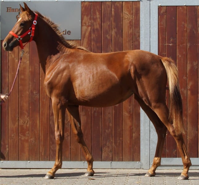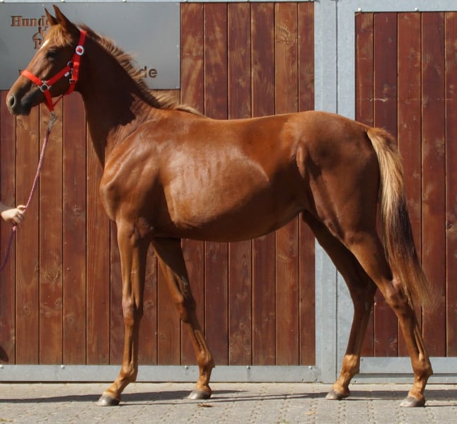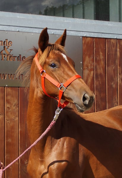 Gender: Mare Breed: Rhineland Riding Horse Pedigree: Quantensprung x Quaside MD by DSP Quasi Gold MD Age: Born 01.04.2024 Mare with an excellent dressage pedigree She is equipped with 3 good basic gaits Knows the foal ABC and is people-oriented She can be led and is easy to halter in the pasture. For more information, call 0176 62495567
