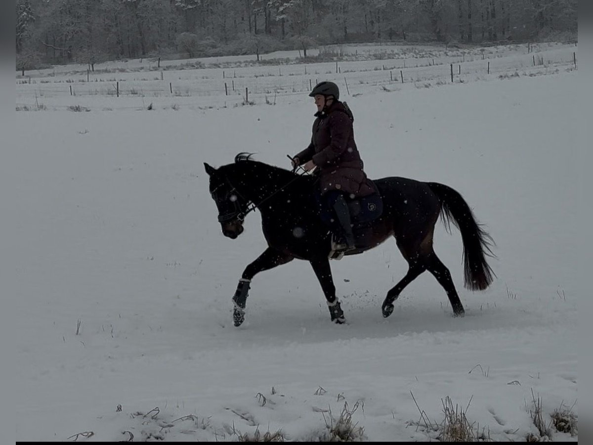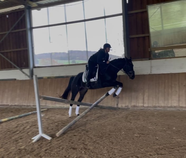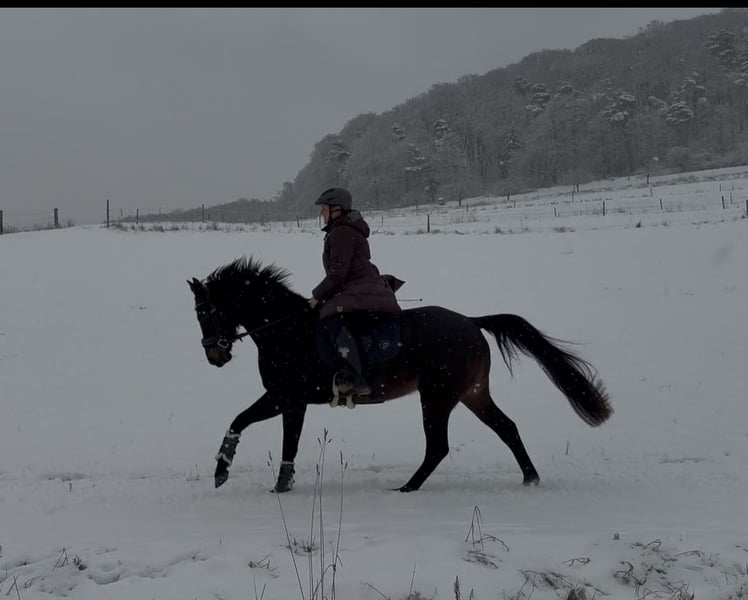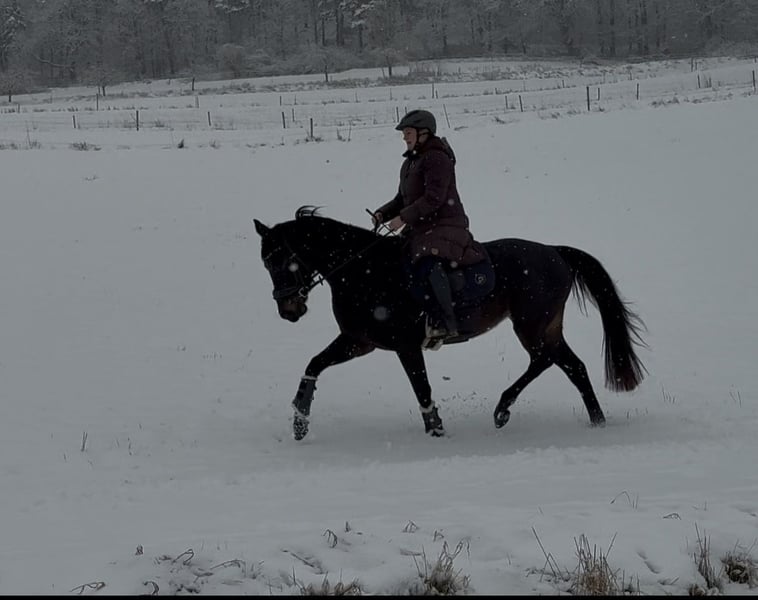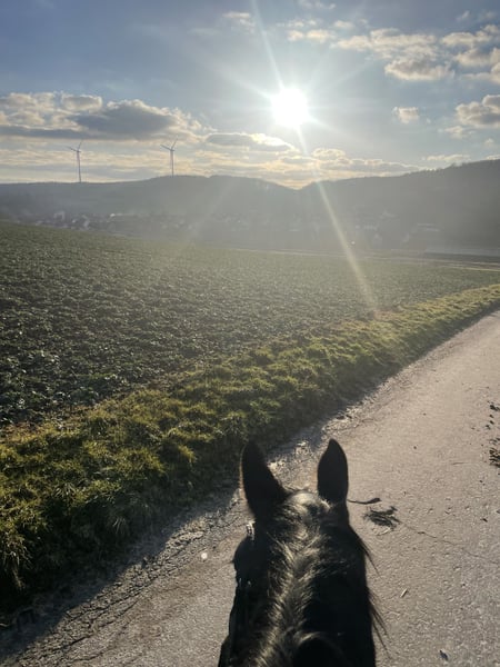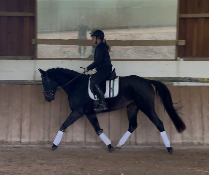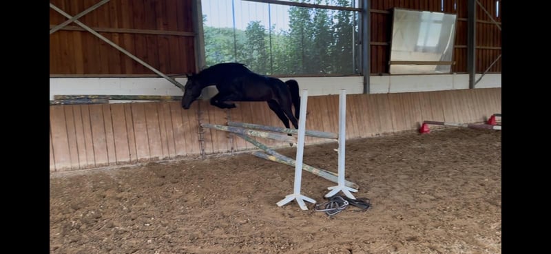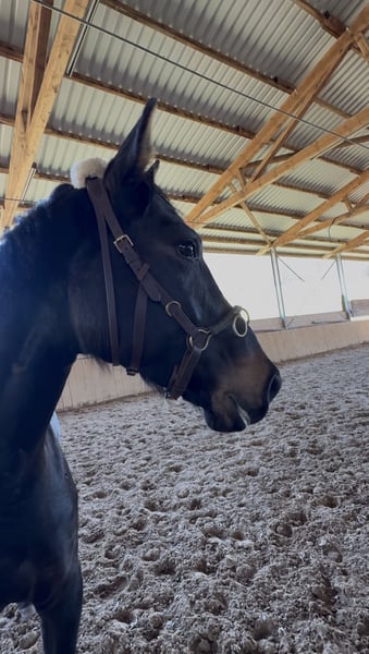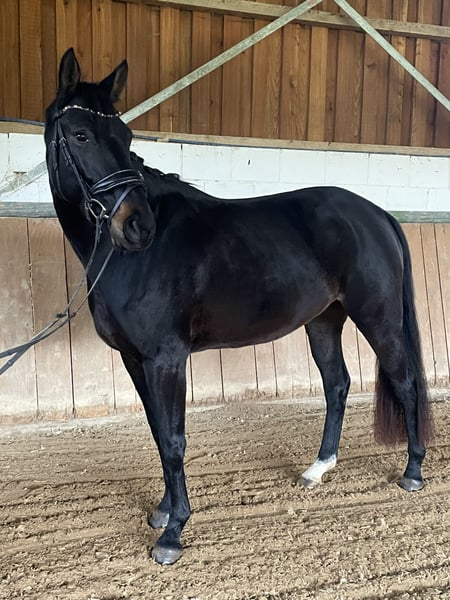Directly from the breeder, Elli is looking for a new, loving home. Elli is a 4-year-old mare by Eckhardt x Granikos x Sherwood. Not only is Elli beautiful, but she is also absolutely rideable and clear-minded, with three very good gaits. She impresses with her rhythm and work ethic. Elli was started under saddle at the end of her 3-year-old year and has been out on the trails three times. After spending the spring in the pasture, she is now slowly being introduced to dressage work, making her ready for further training. She also shows talent over jumps, so nothing stands in the way of a versatile education. Elli goes out calmly in a group and alone in all gaits. Children, dogs, tractors, sheep, cows, etc. are absolutely normal for her. She has grown up in a herd environment with us and is well socialized. She is still growing at the moment. Mare, 4 years old 160 cm Eckhardt x Granikos x Sherwood ‼️ For serious inquiries, please call 0171/8353415‼️