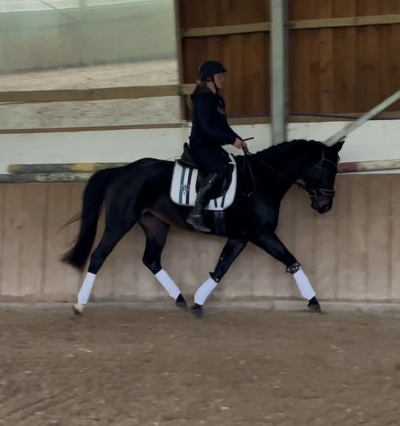 Elli F ist eine 5 jährige Rheinländer Stute aus dem direkten V.d. Decken Stamm. Sie besticht durch ihre absolute Rittigkeit, Schönheit und Korrektheit, bei drei sehr guten GGA. Dabei ist sie mit sehr angenehmen Go ausgestattet, ist ganz fein am Sitz zu reiten, leicht an der Hand, sodass sie bei jeder Trainingseinheit einfach nur Spaß macht. Elli ist absolut kopfklar und lernt sehr schnell. Daher bietet sie sich auch super als Juniorenpferd an. Sie wurde vielseitig ausgebildet und geht entspannt in allen GGA in der Gruppe und alleine ins Gelände. Bei ihren ersten Sprüngen unterm Reiter zeigt sie auch viel Talent, Einstellung und Freude. Sie kommt direkt vom Züchter und ist artgerecht im Herdenverband aufgewachsen, sodass sie bestens sozialisiert ist. —Eckhardt x Granikos x Sherwood —162 cm — 5 Jahre — Dressurpferde A fertig — Barhuf — Gesund (6 aktuelle Röntgenbilder ohne Befund vorhanden) — die Reiterin ist 170 cm ‼️bei ernsthaftem Interesse bitte ich um Anruf 0171/8353415‼️