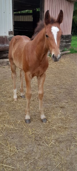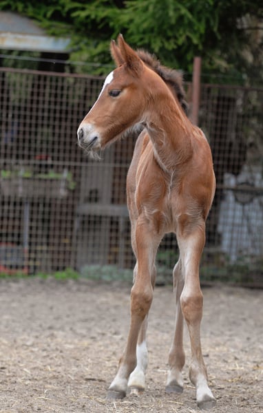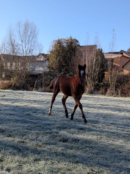 Van Helsing wurde bei uns geboren, sein Vater ist der im Landgestüt Moritzburg stationierte Valentino, seine Erfolgsliste bitten wir der Vollständigkeit halber auf der HP des Landgestütes Moritzburg nachzulesen. Seine Mutter brachte bereits 2 sehr bewegungsstarke Fohlen mit 9,5 und 8,5 in der Bewegungsnote zu Fohlenschau. Auch sie zeichnen sich durch einen freundlichen und sehr braven Charakter aus. Van Helsing selbst machte zur Fohlenschau den Pausenclown und zeigte sich für seine Verhältnisse eher unter seinem Niveau und erhielt 8,5 in der Bewegung, obwohl er über deutlich mehr Potential verfügt,das jedoch an diesem Tag nicht zeigte. Ausstrahlung und Präsenz verfügt er vom ersten Tag an und beeindruckt mit Mut,ohne Scheu nimmt er alle Aufgaben an und zeigt sich bis zum heutigen Tag überaus gehorsam. Er ist ein sehr unkompliziertes Fohlen, ist top halferführig,fürchtet sich nicht wenn er mal alleine ist und kommt mit allen Situationen mit Ruhe und Überblick seinerseits sehr gut klar. Wir sehen ihn ebenso im gehobenen Fahrsport, hier vielleicht sogar als imposanten Einspänner wie auch als tolles Reitpferd. Aufgrund des außergewöhnlichen Pedigrees seiner Mutter mit Anschluss an den englischen Vollblüter Signum xx vereint er sowohl die Vorzüge des Schweren Warmblüters wie auch die Leichtfüßigkeit, besonders in der Galoppade,des Vollblüters. Charakterlich hat er das unerschütterlich coole Temperament des Schweren Warmblutes, keine Nervigkeit und keine Spinnereien.