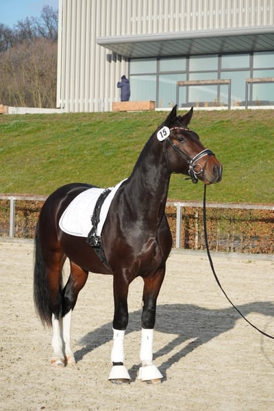 Na zlecenie hodowcy prezentujemy konia czołowego rasy czołowego typu czołowego, Lexters Leif, urodzonego w 2023 roku. Uroczy ciemnogniady waży 163 cm w kłębie i ma obwód kości śródręcza 24 cm. Wziął udział w dniach hodowlanych w listopadzie w Moritzburgu, dlatego na razie jest jeszcze ogierem, jednak nie wykazuje żadnych cech typowych dla ogierów. Leif ma znakomity charakter, jest całkowicie odważny i chętnie pracuje. Codziennie zachwyca swoim przyjemnym usposobieniem, rzadko się denerwuje, co czyni go wszechstronnym partnerem do różnych zastosowań. Dzięki doskonałemu chybaniu, rytmicznemu kłusowi i pięknej, dynamicznej galopadzie jest idealnym partnerem dla ambitnych jeźdźców lub dla jeźdźców rekreacyjnych na wyższym poziomie. Ze względu na dobrą muskulaturę, przygotowując go do selekcji ogierów, oraz podczas dni hodowlanych w Moritzburgu testowaliśmy go z obciążeniem jeźdźca. W tym testie pokazał się jako spokojny i bardzo łatwy w obsłudze. W razie zainteresowania chętnie udzielę dodatkowych informacji i umówię się na oględziny.