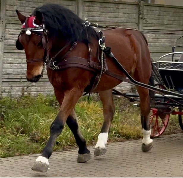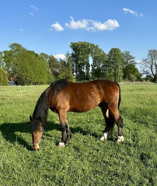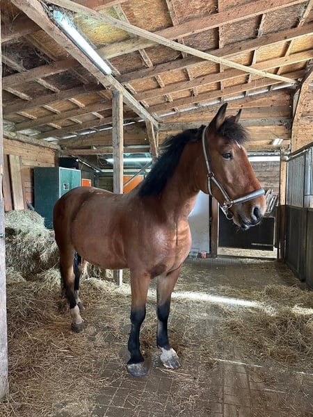 Dieser junge Wallach mit einer Größe von 1,65 m ist ein absoluter Hingucker. Er ist eingefahren und gut geritten. Menschenbezogen. Kennt Platz, Reithalle, Gelände, Trecker etc. Lebt z. Zt. im Offenstall; kennt aber auch Boxenhaltung.