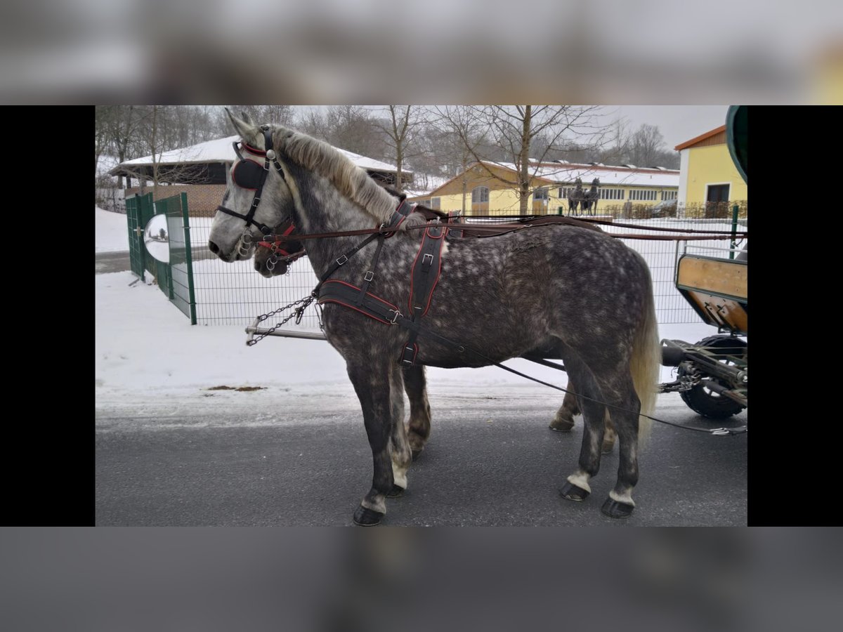 Remus, a 5-year-old heavy Warmblood gelding, approximately 16.1 hh. A well-trained SW (Südwestdeutsches) gelding with an excellent temperament, easy to handle, confident in traffic, and trailered safely. He has experience driving single and pair harness and has been ridden for leisure. A striking gray with great presence, correctly built with a very good walk. A horse you don't come across every day. €7,000.00 Phone: 0171/3132074