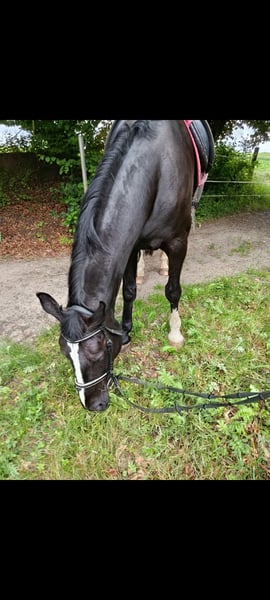 Ein neues Zuhause als Freizeit Fahr- und Reitpferd sucht die 2009 geborene Schwere Warmblutstute Gloria. Sie ist ca 1,64 m groß und besitzt eine sehr schöne dunkle Rappfarbe. Sie hatte bereits Fohlen. Wir haben sie im Frühjahr 2025 als Schulpferd sowohl zum Reiten als auch zum Fahren gekauft und sie ist vorm Wagen wirklich das ideale frische und dennoch gelassene Freizeitpferd. Auch unter dem Reiter macht sie im Gelände großen Spaß mit gutem Vorwärtsdrang ohne dabei heiß zu werden. Was ihr jedoch keine wirkliche Freude bereitet ist die Dressurarbeit, vor allem in der Reithalle und auch die dortige Galopparbeit, wenn man dies öfter die Woche möchte, was im Winterhalbjahr leider im Schulbetrieb meistens der Fall ist. Die Abwechslung im Sommer mit Geländereiten und vor allem Fahren bekommt ihr deutlich besser, dann ist sie auch beim dressurmäßigem Reiten motivierter, vor allem bei Reitern die eine sehr ruhige Zügelführung haben. Sie steht zwischen anderen Stuten in einer Paddockbox und geht mit diesen auch in einer größeren Gruppe auf die Koppel oder Paddock. Krankheiten sind uns keine bekannt. Videos eingespannt vom Vorbesitzer vorhanden. Zwei Jahre ältere Stute (braune) als Gespannpartner könnte mit dazu erworben werden.