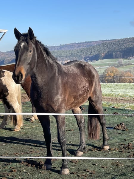 Dreijährige sächsisch thüringische schwere Warmblutstute zu verkaufen. Geboren im Februar 2023. Sie ist unglaublich lieb und menschenbezogen, kennt Hänger fahren, Straßenverkehr, ist lieb beim Schmied und im Umgang. Sie wird nur aufgrund von doppeltem menschlichen Familiennachwuchs in gute Hände verkauft. Artgerecht in der Herde aufgewachsen ist sie nun bereit für alle Sparten des Pferdesports. Aufgrund ihres ruhigen und ausgeglichenen Temperaments und ihrer tollen Gänge ist sie das ideale Fahr- und Reitpferd. Man kann sie problemlos aus der Herde herausnehmen und mit ihr spazieren gehen. Große Maschinen, Motorräder, Busse, LKW stören sie nicht. Sie kennt bereits Sattel und Trense. Selbstverständlich ist sie regelmäßig geimpft und entwurmt. Ihr Vater loriot war Bundeschampion 2019. Im Sommer hat sie ein leichtes Ekzem, das mit ihrer Decke, die mitgegeben wird, leicht in den Griff zu bekommen ist. Sie benötigt keine Medikamente, Cremes oder Ähnliches.