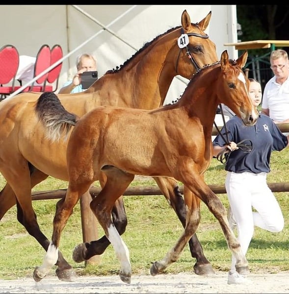 „CALLISTOS“ – Wunderschöner Hengstanwärter von Cape Calidus x Landzauber x Consens x Campione Mit allem ausgestattet, präsentiert sich dieses Fohlen als absoluter Eyecatcher. Ein typstarkes Fohlen, das durch Ausdruck und korrektes Fundament zu begeistern weiß. „Großrahmig mit raumgreifenden, lockeren Bewegungen – so, wie wir uns heute ein Springpferd wünschen“, kommentierte auch die Jury beim Elitefohlenchampionat, wo er mit 79 Punkten einen beachtlichen dritten Platz erzielte. Die genetische Grundlage bildet hier der Holsteiner Stamm 1333, der mit unzähligen Sportpferden die Holsteiner Zucht entscheidend geprägt hat. Mutter Claire, eine Tochter des Landzauber, lässt hier auch ihre ausgesprochenen Reitpferdepoints aufleuchten. Großmutter Veronique vom Consens ist Vollschwester zu Stubbenhof’s Can Be Good, der erfolgreich bis 1,45 m im Parcours unterwegs ist. Im weiteren Stamm finden sich erfolgreiche Springpferde sowie der Lancetto-Sohn Lancelot, der – wie sein Vater – in der Dressur bis Inter I hoch erfolgreich war. Sein Vater Cape Calidus begeisterte bereits bei seiner Körung in Holstein mit überragendem Springen, was er auch als Prüfungssieger seines 50-Tage-Tests in Adelheidsdorf eindrucksvoll unter Beweis stellte. Er ist mehrfach in Springpferdeprüfungen siegreich und qualifizierte sich zudem für das Bundeschampionat. Über den Jahrhundertvererber Casall und den unvergessenen Schimmel Calido erhält Callistos die begehrte genetische Absicherung dieser beiden Zuchtheroen. Ein Hengstanwärter mit Format – und dem notwendigen Background der Holsteiner Zucht. “CALLISTOS” – Stunning Stallion Prospect by Cape Calidus x Landzauber x Consens x Campione Equipped with everything one could wish for, this colt presents himself as a true eye-catcher. A strongly typey foal that impresses with expression and correct conformation. “Large-framed with ground-covering, elastic movements – exactly what we look for in a modern show jumper,” was the jury’s comment at the Elite Foal Championship, where he earned an impressive third place with 79 points. His genetic foundation lies in the Holsteiner dam line 1333, which has significantly shaped Holsteiner breeding with countless sport horses. His dam Claire, a daughter of Landzauber, shines with outstanding riding-horse qualities. His granddam Veronique by Consens is the full sister of Stubbenhof’s Can Be Good, who has been successful up to 1.45m in show jumping. Further down the dam line are successful show jumpers as well as Lancelot, a son of Lancetto, who—like his sire—proved highly successful in dressage up to Inter I. His sire Cape Calidus already captivated at his Holstein licensing with outstanding jumping ability, which he confirmed as the clear winner of his 50-day test in Adelheidsdorf. He has won multiple young horse show jumping classes and also qualified for the German Bundeschampionat. Through the legendary sire Casall and the unforgettable grey Calido, Callistos carries the coveted genetic security of these two breeding heroes. A stallion prospect with presence—and the strong foundation of Holsteiner breeding.