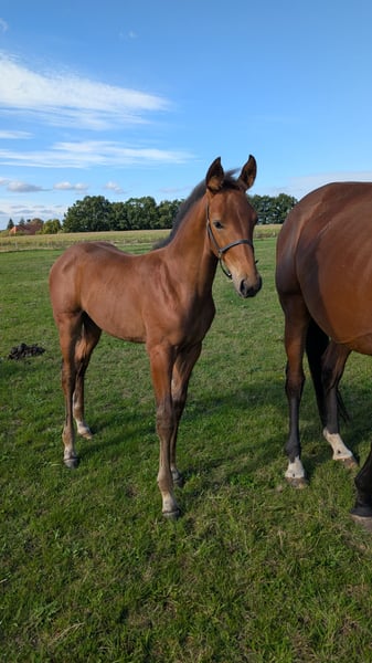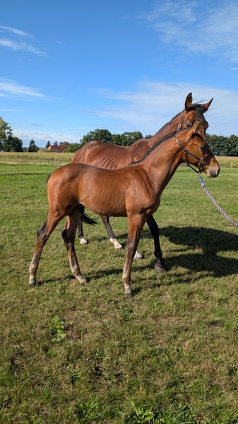 Wir bieten hier unseren vielversprechenden Nachwuchsathleten von Estobar NRW an. Sein Vater "Estobar NRW beweist es immer wieder: E steht für Erfolg. Als Bewahrer der westfälischen E-Linie des Ehrentusch ist dieser Hengst schon jetzt eine lebende Legende. Dabei sorgte er nicht nur für zahlreiche Pferde von internationalem Format, sondern steht mit seinen Nachkommen auch für Rittigkeit, Charakterstärke und Reitkomfort. Rittigkeit, Schwung, Kraft und ein Reitgefühl, das seinesgleichen sucht. Heute sind vor allem seine Nachkommen das beste Aushängeschild für diesen prägenden Hengst. Der Einzug in die Top 1% der besten Reitpferde-Macher unterstreicht seine Vererbungskraft. Geboren am 28.06.2025 weist er eine bemerkenswerte Bewegungsqualität vor. Der schicke und optisch ansprechende langbeinige braune Hengst ist korrekt gebaut und begeistert jeden mit seinem Charme und Ausdruck. Er zeigt sich stets interessiert und aufgeschlossen und lässt keine Wünsche offen. Seine Mutter, abstammend von Juventus x Sir Sandro zeichnet sich durch eine enorme Rittigkeit aus. Sie ist leistungsgeprüft, wobei besonders ihr Schritt und Galopp hervorzuheben sind.