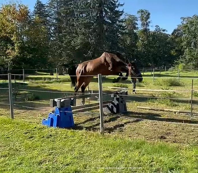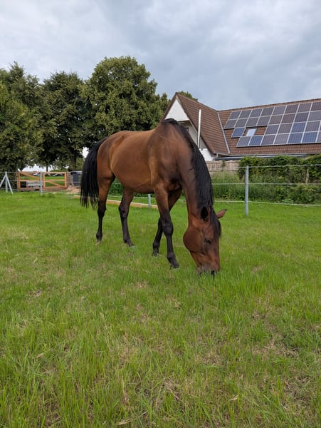 Bonjour à tous, En raison d'une réduction de notre effectif, nous mettons en vente notre hongre de 6 ans, un Mecklenburg. Il a été élevé en paddock ouvert / élevage robuste. Nous souhaiterions continuer à lui offrir au moins un environnement en paddock ouvert. Ce joli garçon est encore brut et totalement inexploré. Il recherche donc une main bienveillante pour le soutenir dans son développement. Il mesure 1,74 m. Il est régulièrement présenté au maréchal-ferrant. En raison de ses origines, il est également intéressant pour le saut d'obstacles ou le concours complet. Son père est Lezard 7, descendant de Cor de la Bryère / Landadel / Landgraf. Sa mère provient d'une lignée polonaise de chevaux de saut. Pour toute demande sérieuse, n'hésitez pas à nous contacter. Ce cheval n'est pas disponible à l'essai.