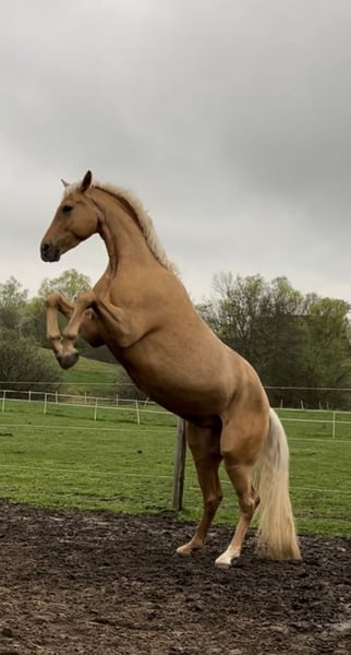 Origine : V : Quaside MD / MV : Fürst Fugger Taille : 1,65 m Sexe : Étalon Couleur : Palomino Description : Hansi est un magnifique étalon expressif doté d’une origine attrayante et de bonnes allures de base. En 2023, il a été monté de manière professionnelle, mais je n’ai pas pu poursuivre son entraînement en raison de contraintes de temps et de circonstances personnelles. Hansi est très sensible, attentif et nécessite une personne expérimentée et patiente, capable de le remettre en confiance avec calme, constance et douceur. Réservé aux cavaliers ou entraîneurs expérimentés, qui aiment travailler avec un jeune cheval plein de potentiel. Non adapté aux débutants ! Santé : Certificat vétérinaire datant de 2021 disponible. Il est régulièrement vacciné et déparasité. Pour des raisons personnelles, je ne peux pas lui offrir l’attention et le développement qu’il mérite. Je cherche donc une nouvelle famille où il pourra repartir sur de bonnes bases dans un environnement calme. Vente non urgente, uniquement à des personnes expérimentées et responsables. Lieu : 23936, près d’Upahl Contact : 01738225939