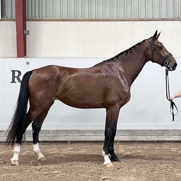 A lovely mare with all the potential to become something truly special. She has always been uncomplicated to ride – kind, brave, and straightforward. She has good natural energy and gives a very pleasant, balanced feeling under saddle. Davinia is tall at the withers but fairly compact in her frame, which makes her feel agile and easy to ride. She is responsive to light aids. The rider shown in the video is 172 cm tall. She completed the Young Horse Test in the autumn as a 3-year-old, achieving Class I results with scores of 8 for both trot and canter. She free-jumps with great joy, scope, and elasticity. Davinia is a friendly, social mare with a calm and kind temperament, easy to handle in all situations. She is well accustomed to the farrier, loading, and transportation, and travels quietly. She thrives both in a traditional stable and in loose housing. Having spent a lot of time in loose housing, she is used to living with many different types of horses. Pedigree: Sire: Jameson RS2 – Dutch stallion who won extensively in the Netherlands as a young horse and competed at the World Championships for Young Dressage Horses as a 5-year-old. Dam sire: Flemmingh – the influential Holsteiner stallion, one of the most important contributors to Dutch dressage breeding. Dam line: Dam, granddam, and great-granddam are all premium (Diploma) mares. The granddam, Donett, was placed at Falsterbo and Elmia as a 4-year-old. X-rays of the legs were taken at 2 years of age with no remarks (clean).