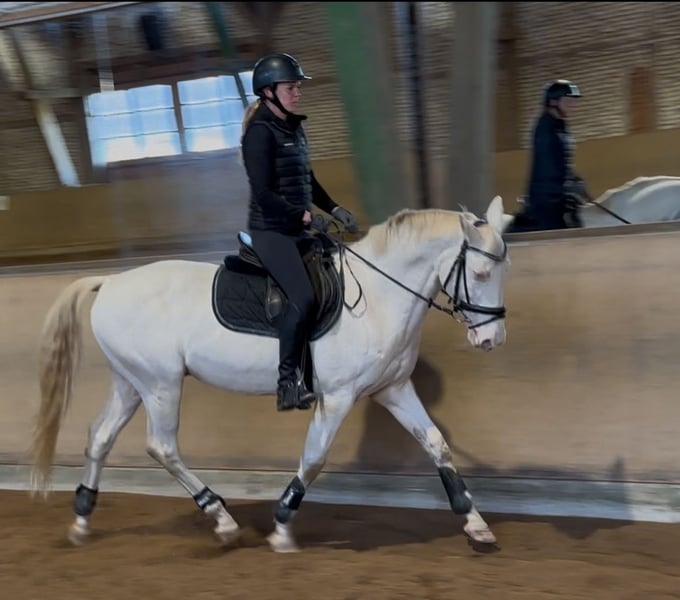 Wij bieden onze Ford Mustang, bijnaam Froggi, te koop aan. Geboren in 2010, een Tsjechisch warmbloed in een prachtige Cremello kleur. Wij zijn een goed gerunde rijschool in de buurt van München. Na een bepaalde tijd in de lessen zoeken onze lespaarden een mooi, welverdiend thuis in privébezit. Froggi heeft een stokmaat van ongeveer 163 cm. Froggi vertoont bij ons geen ongewenst gedrag zoals bokken of doorlopen. Geschikt voor ruiters met minimaal niveau E. Bij ons wordt hij vooral in de binnenbak gereden. We maken geen buitenritten met de lespaarden, soms rijden we op de buitenbak. Froggi is opgeleid in dressuur tot L-niveau en in springen tot A-niveau. Froggi gaat bij ons dagelijks meerdere uren op de wei en staat in een box. Froggi heeft bij ons geen gezondheidsproblemen gehad en is altijd fit en gemotiveerd. Zijn tanden worden regelmatig gecontroleerd, laatst in voorjaar 2025. Graag maken we een afspraak voor een proefrit en kennismaking. Neem gerust contact met mij op via bericht. Video beschikbaar.