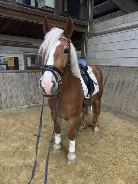 Unser Vereinspferd Sunny sucht ein neues und liebevolles Zuhause. Sie steht noch am Anfang Ihrer Ausbildung und kann deshalb nur bedingt bei jungen und unerfahrenen Reitschülern eingesetzt werden. Sunny eignet sich bestens als vielseitig einsetzbares Freizeitpferd. Auch in der Dressur zeigt sie sich sehr motiviert. Sie ist absolut brav und ehrlich, erfordert aber aufgrund Ihrer Statur und Unerfahrenheit einen klaren Umgang. Charakterlich sehr ausgeglichen und dem Menschen zugewandt. Sie kennt 24/7 Herdenhaltung in einer gemischten Herde und Boxenhaltung. Das Pferd ist schmiede- und verladefromm, wurde regelmäßig entwurmt und geimpft. Auch die Zähne wurden regelmäßig kontrolliert. Alter: 4,5 Jahre Stockmaß: 154 cm Rasse: Kaltblut-Mix Bei ernsthaftem Interesse gerne unter 01722791835 melden – wir freuen uns über seriöse Anfragen.