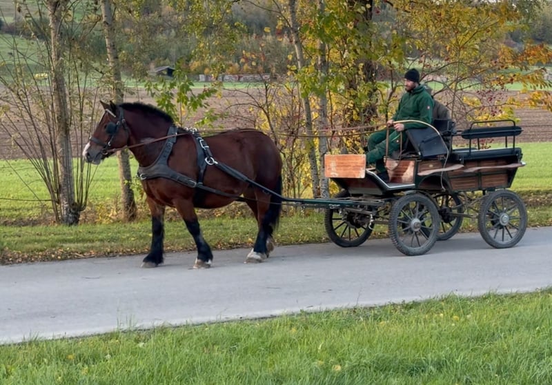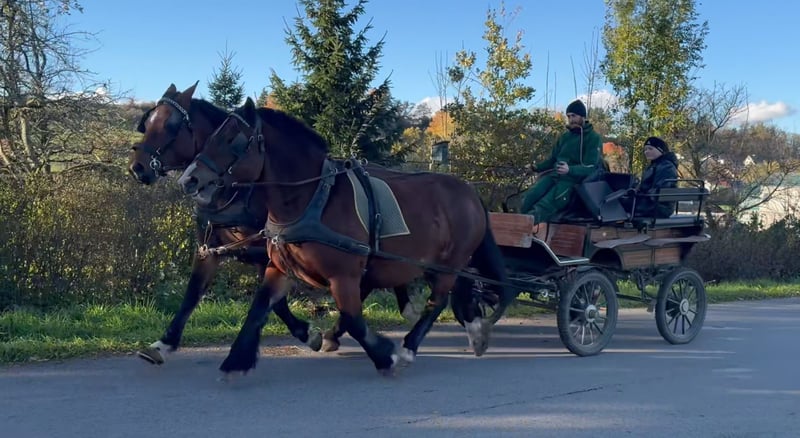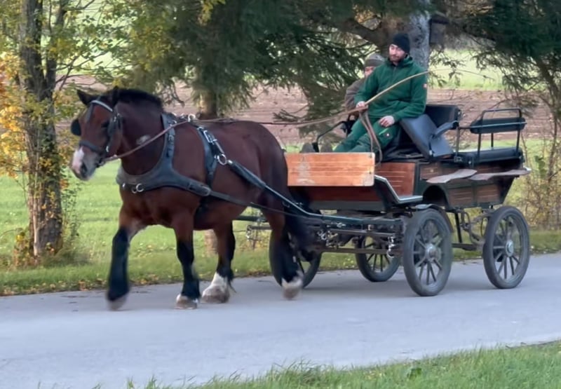 Gastonia is a small draft mare that is trained for both single and pair driving. She demonstrates suitability for therapy work and is a pleasure to ride in the countryside. She is hardworking and clear-minded. Her canter is balanced and easy to sit. She remains relaxed during hoof care. Gastonia has experience working with children, and has been driven and ridden both singly and in pairs. We are happy to provide further information by phone.