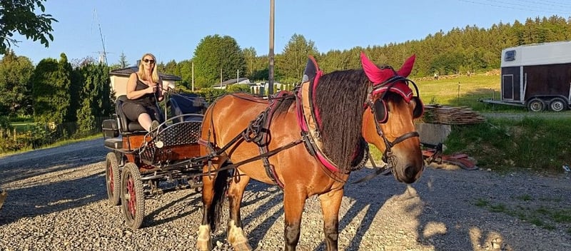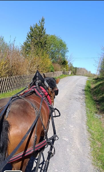 I am selling my 8-year-old Polish cold-blood mare, a sporty type. She is driven single harness by me but has also competed in pairs at the breeding farm. She is reliable and confident in front of the carriage. I also harness her alone and go on solo drives. Under saddle, she displays her sporty nature and enjoys small dressage exercises. She is comfortable riding alone or in a group, both in the terrain and on the riding arena. Groundwork and lunging are also part of her training. She is fully shod, loads effortlessly by herself, and is very well-behaved during trailer transport. She is steady-nerved, no spook, and moves with beautiful, willing gaits. She is accustomed to orientation rides and unfamiliar environments such as indoor arenas and riding fields. Jaschka has a typical, somewhat stubborn cold-blooded personality and often tests her handler. A confident and consistent handling approach is very important for her. She is used to open stables and paddock life, and gets along well with mares and geldings. Her teeth were checked in April, and her tetanus vaccination is up to date. If you are looking for a lively partner for driving and riding, she is a fantastic companion with her colleague by her side. Equipment such as carriage, saddle, bridle, harness, etc., can be purchased together.