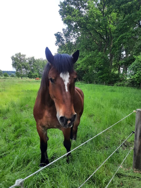 Helaas moet ik om persoonlijke redenen afstand doen van mijn paard Fips: Fips is een 9-jarige Rijnisch-Duitse koudbloed ruin met een stokmaat van ongeveer 1,74 m. Hij is voor een koudbloed vrij sportief en beweegt zich eerder “lichtvoetig” met mooie, vloeiende gangen. Zijn “Go” ervaar ik tijdens het rijden als zeer prettig, niet te voorwaarts noch te lui. 😊 In de omgang met mensen is hij heel open en staat hij graag overal bij. Hij is niet de grootste knuffelaar, maar hij is dol op knuffels van de mens of het samen verzorgen van de vacht met soortgenoten. In de kudde is hij goed te combineren met zowel hengsten als merries. Hij springt niet op. Hij voelt zich het best wanneer hij een eerlijke leider of leidster heeft, waar hij zich aan kan optrekken. Ik zou voor hem een kleine kudde van ongeveer 4-6 paarden wensen. Met deze grootte hebben wij de beste ervaringen; grote kuddes met frequente wisselingen van paarden passen niet zo goed bij hem. Fips is bereden in stap en draf, met galop zijn we begonnen, maar daar is nog oefening voor nodig. Daarnaast wordt hij aan de longe en dubbele longe getraind (alle gangen) en wordt er gymnastische werk vanaf de grond en onder het zadel gedaan. Bij nieuwe taken of in onbekende omgeving heeft hij soms even de tijd nodig om zich aan te passen, maar met rust en vertrouwen pakt hij ook nieuwe situaties heel goed op. We zijn af en toe op een cursus geweest (stangenrijden en rustgevendheid), waar hij het heel goed deed. Tijdens een winter ben ik regelmatig alleen met hem naar een lokale rijvereniging gereden voor dressuurtraining in de rijhal; het laden gaat probleemloos en hij blijft rustig wachten als hij even op de trailer moet wachten. Voor beginners of herintreders is hij echter niet geschikt, omdat hij een ervaren begeleider nodig heeft die hem mentaal en fysiek op een goede en regelmatige wijze ondersteunt. Gezondheid: Fips heeft een chronische darmontsteking die goed te behandelen is. Graag vertel ik hier meer over als er interesse is. Zijn hoefsmid komt elke 6-8 weken, hij wordt bij mij barefoot gereden. Zijn tanden worden regelmatig gecontroleerd en voor het laatst in juli van dit jaar (07/25) gevijld. De vaccinaties (tetanus, griep en herpes) zijn up-to-date. Voeding: Fips verdraagt kwalitatief hoogwaardig, vrij droge hooi- en ruwvoeder, evenals de meeste in de handel verkrijgbare voeder- en supplementen. Zo veel mogelijk weidegang is echter het beste voor hem; hij heeft GEEN problemen met hoefbevangenheid of overgewicht. Accessoires: De uitrusting wordt op verzoek mee verkocht, waaronder regendekens, winterdekens, vliegen-dekens, zweetdekens, halsters, bitringen, bit en meer. Een passende dressuurzadel (18 inch zitvlak, stangloos verstelbaar) kan voor €1.200,- VB worden overgenomen. Kennismaken en proefritten zijn mogelijk na afspraak. Ook beantwoord ik graag persoonlijk diverse vragen. Ik kijk uit naar serieuze interesse. 😊
