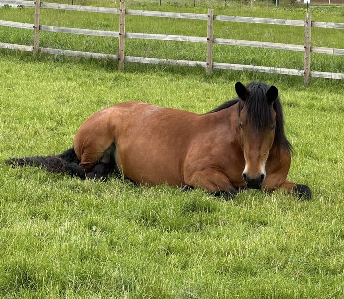 Schweren Herzens verkaufe ich aus gesundheitlichen Gründen meine 11 jährige Kaltblutstute. • Niederländisches Kaltblut - Friesen Mix • Stockmaß 1,61m • barhuf • gechippt und geimpft • regelmäßig entwurmt/getestet • Freizeit geritten Arwi ist eine liebevolle, menschenbezogene und brave Stute, die gerne mitarbeitet und ihrem Reiter gefallen möchte. Sie ist ein absolutes Herzenspferd. Manchmal ist Arwi ein Angsthase, weshalb sie einen erfahrenen und souveränen Pferdemenschen benötigt. Bei Traktoren, Autos und Hunden bleibt sie cool und gelassen. Arwi lässt sich gerne putzen und betüddeln. Sie hört auf ihren Namen und freut sich über Ansprache, die sie mit voller Aufmerksamkeit belohnt. Im Viereck und im Gelände ist sie in allen drei Gangarten freizeitmäßig geritten. Es steckt auf jeden Fall mehr Potential in ihr. Dieses konnte ich aus gesundheitlichen Gründen nicht entsprechend fördern. Ich könnte mir Arwi auch gut Zweispännig an der Kutsche vorstellen. Arwi ist gesund und beim Schmied, wo sie regelmäßig vorgestellt wird, und Tierarzt brav. Bei uns lebt Arwi im Aktivstall in einer großen gemischten Herde. Für sie wünsche ich mir weiterhin Offenstall- und Herdenhaltung, da sie in dieser Haltungsform ausgeglichen und zufrieden ist. Arwi ist in der Herde ein soziales und faireres Pferd, will keinen Stress und geht Unruhen aus dem Weg. Sie ist eher rangniedrig. Sattel und Equipment kann zusätzlich mit erworben werden. Bitte keine Händler Anfragen! Ich suche ein tolles neues zu Hause für Arwi mit Menschen die sie lieben. Wenn du dir Arwi als deinen Freizeitpartner vorstellen könntest, freuen wir uns auf ein Kennenlernen. Arwi ist kein Notverkauf. Platz vor Preis. Der Preis ist zweitrangig, wenn Arwi ein schönes neues Zuhause bekommt.