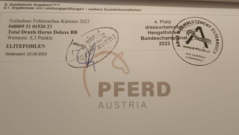 Verkaufe österreichisches Warmblut Hengst von 2023 – Ein vielversprechendes Nachwuchstalent! Total Draxls Horus Deluxe BB ist ein 2,5 Jähriger Dressurbetonter Fuchs Hengst mit Top Charakter und Top Abstammung (Total Hope/Fürst Romancier) Er hat 3 hervorragende GGA für das große Viereck und hat Körpotenzial Horus ist beim Kärntner Warmblut Festival 2023 als Landes Res.Sieger mit der WN 8,3 bei den Dressurbetonten Hengstfohlen (Elite Fohlen)vom Platz gegangen und hat sich für das Bundeschampionat qualifiziert. Beim Bundeschampionat in Stadl-Paura 2023 erreichte er das Finale mit der Hervorragenden WN 8, 7 den 4ten Platz bei einem sehr starken Starterfeld der Dressurbetonten Hengstfohlen Bei Interesse oder für weitere Informationen stehe ich Ihnen gerne zur Verfügung. Kontaktieren Sie mich für einen persönlichen Eindruck