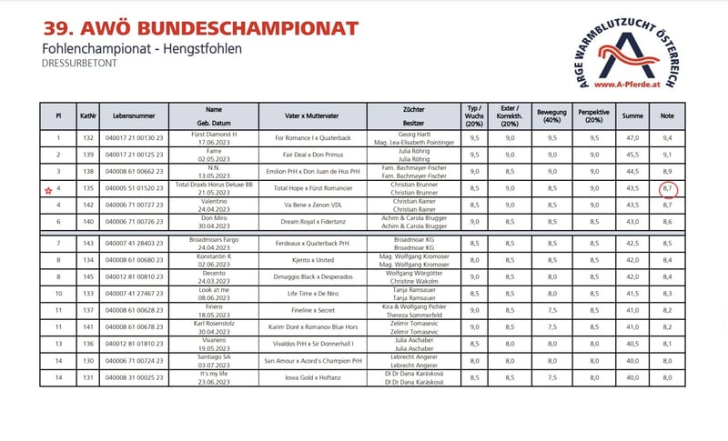 Verkaufe österreichischen Warmblut Hengst von 2023 – Ein vielversprechendes Nachwuchstalent! Total Draxls Horus Deluxe BB ist ein 2,5 Jähriger Dressurbetonter Fuchs Hengst mit Top Charakter und Top Abstammung (Total Hope/Fürst Romancier/ Don Frederico) Er hat 3 hervorragende GGA für das große Viereck und hat Körpotenzial Horus ist beim Kärntner Warmblut Festival 2023 als Landes Res.Sieger mit der WN 8,3 bei den Dressurbetonten Hengstfohlen (Elite Fohlen)vom Platz gegangen und hat sich für das Bundeschampionat qualifiziert. Beim Bundeschampionat in Stadl-Paura 2023 erreichte er das Finale mit der Hervorragenden WN 8, 7 den 4ten Platz bei einem sehr starken Starterfeld der Dressurbetonten Hengstfohlen Bei Interesse oder für weitere Informationen stehe ich Ihnen gerne zur Verfügung. Kontaktieren Sie mich für einen persönlichen Eindruck