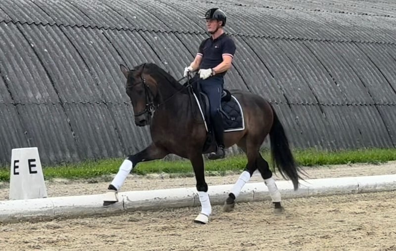Cavallo di 5 anni, stallone, che vince tutte le competizioni per giovani cavalli a livello DPL, con un punteggio di 9,0 nel trotto! È molto facile da montare, sempre disposto a lavorare e non troppo grande (1,65 m), quindi sarebbe un ottimo cavallo per i giovani cavalieri. Ha già partecipato a competizioni internazionali, attualmente a livello L, ma conosce molto di più (movimenti laterali, avviato alle cambi di galoppo, half-pass…).
