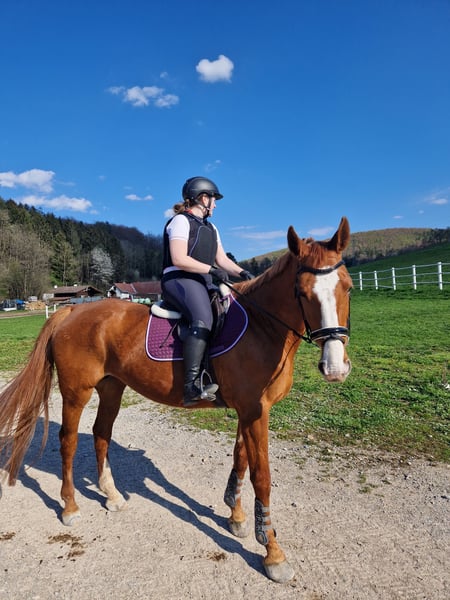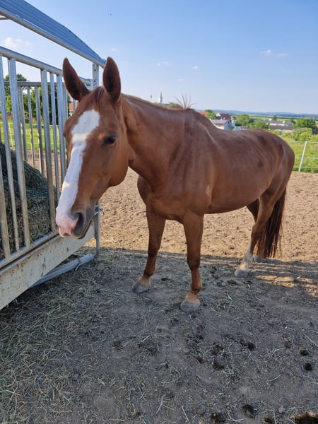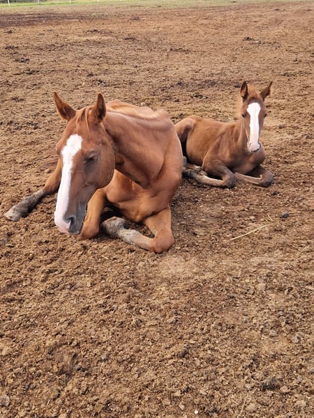 Very affectionate chestnut mare for sale. Our Letizia is looking for a new loving home due to personal circumstances. She is being sold only as a leisure horse. Due to a diagnosis, she is only partially rideable. At the moment, she has a foal at her side. However, she will not be bred again for various reasons. We wish for her to live in a paddock with 2-3 gentle movements per week. She is currently in a mixed herd in a paddock. She is shoer and loading friendly. The foal in the photo is also for sale. A suitable saddle and bridle can be purchased as well. For more information, photos, and videos, please feel free to send a message.