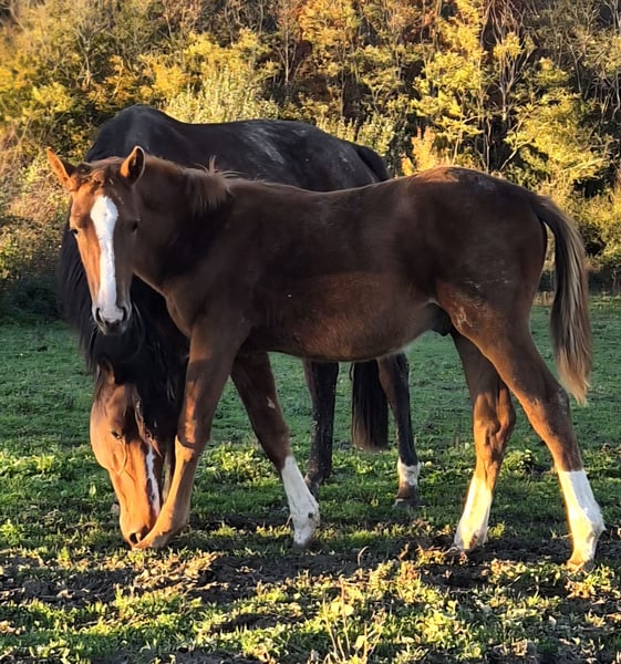 🌟A vendre poulain Selle Français de 2025🌟 Pomellato de Sorento est né le 13.04.25 Père : Killer de Kreisker par Black Cera DK Z et Shirel de Kreisker Mère : Émeraude du Moulin par Sunday de Riverland et Manille du Tot Pourquoi Pomellato ? Et bien comme sa mère a un nom de pierre précieuse j'ai choisi un bijoutier Milanais 😉 Pomellato est un poulain très typé sport et très chic, avec une belle robe alezane, 3 balzanes donc comme le dit le dicton "cheval de roi". Il toisera minimum 1,68 car sa mère toise 1,68m et son père 1,72m. C'est un poulain avec du sang juste ce qu'il faut, qui pourra convenir à un amateur ou un pro. Il a 3 belles allures, est vraiment curieux, doux et adore se faire chouchouter, donc bien manipuler (licolé, attaché et monté dans le van plusieurs fois) Il a participer a un concours foal début août ( Monsieur avait sa jolie crinière piontée ☺️) et a obtenu 15.5 de moyenne. Je suis vétérinaire il est donc à jour vaccination, vermifuges, parage et petit plus a déjà été vu par un confrère vétérinaire ostéopathe 2 fois en control de routine. Prix : 8000 € TTC Il est possible de le laisser au pré/stabule avec foin et compléments jusqu'au printemps 2026 moyennant une pension de 100€ TTC/mois. Visible dans le Jura (39) Pour plus d'informations et de photos/vidéos vous pouvez me joindre au 06.26.02.96.47. A bientôt Dr. Hadjadjeba Audrey, Élevage Les De Sorento