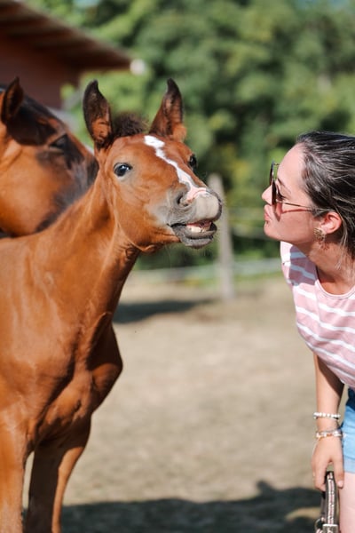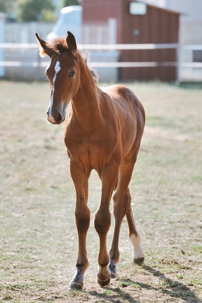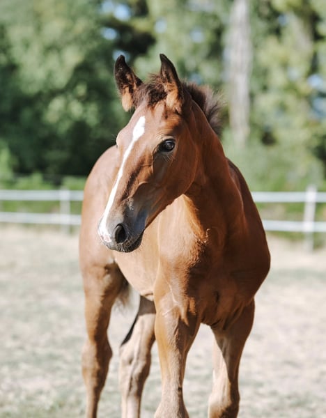 Popcorn d’Amea Gelding, Selle Français, bay, born 28/05/2025 By Chacco Blue II out of Venue de la Côte, ISO 123 (Négus de Talma (Quick Star) x Quadrige Romain) Popcorn is a very people-oriented and intelligent foal, well-handled, with a charming personality already developing. This is our first foal from our excellent mare Venue, a amateur-classified mare competing successfully every weekend, and a performance-oriented sire at 1.60 m. His pedigree is more than proven, featuring the bloodlines of Chacco Blue and Quick Star. Popcorn shows great promise for a sporting career, even for an amateur wishing to develop his future competition horse, thanks to the good temperament of both parents, their respect for the jump, strength, and courage. ⚡️ Breeding ⚡️ ▶️ Sire: Chacco Blue II is an elegant stallion with a strong, well-connected back and good joints. He displays suppleness, good front technique typical of Chacco Blue descendants, and good movement with an ample, well-balanced canter. He is expected to pass on his power, harmonious build, and ease under saddle. (Source: France Étalon) ▶️ Through this cross, we aimed to increase size while maintaining the steel-like mentality, easy temperament, and courage of the mare. Strength also appears to be a common trait of both parents. He will likely grow to over 1.65 m as an adult. Visible in Isère, Rhône-Alpes near Lyon airport