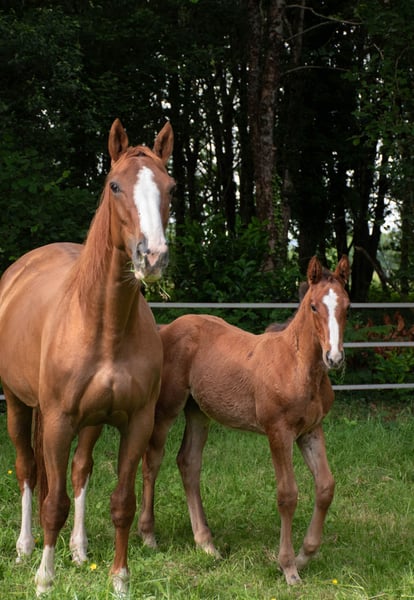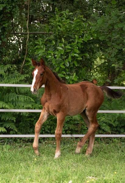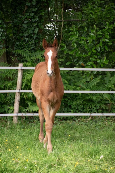 Padington d'Espérance (L’Arc de Triomphe * Dollar de la Pierre * Jarnac) Ogier koniowaty, urodzony 05.03.2025, kasztanowaty Matka: Jain des Caps, SFO, przez Dollar de la Pierre * Jarnac Ojciec: L’Arc de Triomphe, OLD, przez Landor S * Pilot Na lonży, podaje nogi, zna Marechala i przyczepę. Aktualne szczepienia i odrobaczenia, odchowany. Nowsze zdjęcia i filmy na życzenie. Człowiek bardzo przywiązany do młodego konia, ciekawski, z pięknym chodem i sprężystością. Bardzo łatwy w codziennej opiece. Matka widoczna na miejscu.