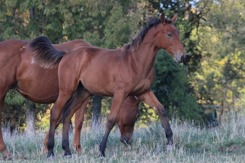 Male Selle Français Foal, bay, of standard size. Poppy has an excellent temperament—calm, straightforward, and quick to learn. He is handled regularly, stands for the farrier, and loads correctly. Up-to-date on deworming and vaccinations. This foal is very human-oriented and eager to learn. He has good bone and frame, with a very typical Selle Français conformation. Genetically, his sire is POPSTAR LOZONAIS (Quick Star x Muguet du Manoir), an SFO-rated stallion with an ISO score of 161, who had a solid competitive career and sired many champions. His dam line includes Rhodésie d'Acy (Pamphile x Le Tot de Semilly), ISO 120, a mare that competed successfully at 120-125 in show jumping. The maternal line features numerous competitors who have jumped over 130. Notably, his fourth dam is Danae, dam of Hilda du Mesnil, who is the dam of Reine du Mesnil, herself the dam of the very talented Baladine du Mesnil, with an ISO of 181. A pedigree that includes many influential Selle Français ancestors and a temperament eager to learn. I highly recommend coming to meet him in person to better appreciate his character and potential.
