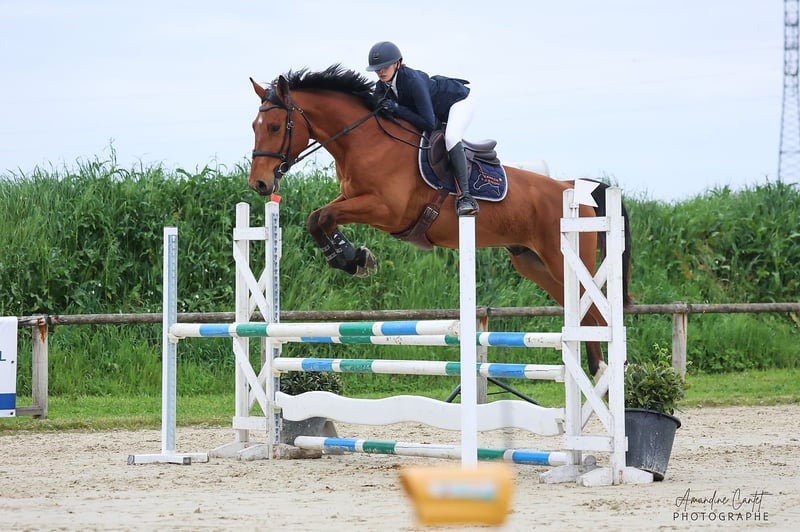 Selle Français castrone di 5 anni Coloro ciliegia Altezza: 1,67 m Figlio di Be Express*HDC SF e Uxane du Ricou SF (Quouglof Rouge) Prima stagione di concorsi nel 2025: - Ciclo classico 5 anni - Formazione 2 - Ciclo libero, 2ª anno È molto socievole con l’uomo, gentile e facile da gestire quotidianamente. Ha forza e un ottimo passo di sospensione. Aggiornato con cure osteopatiche, dentista e vaccinazioni. Non esitate a contattarci per ulteriori informazioni.