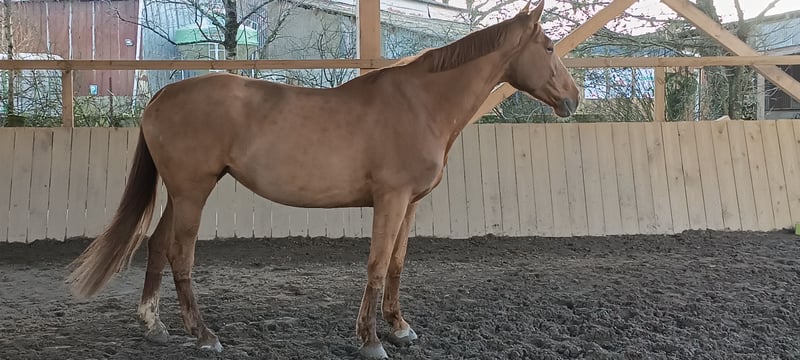 10-jährige Stute Schöne Abstammung: Vagabond de la Pomme x Le Tot de Semilly Ca. 1,68 m groß Hat bereits drei Fohlen durch Embryotransfer bekommen Geht allein im Gelände, reist sehr zuverlässig