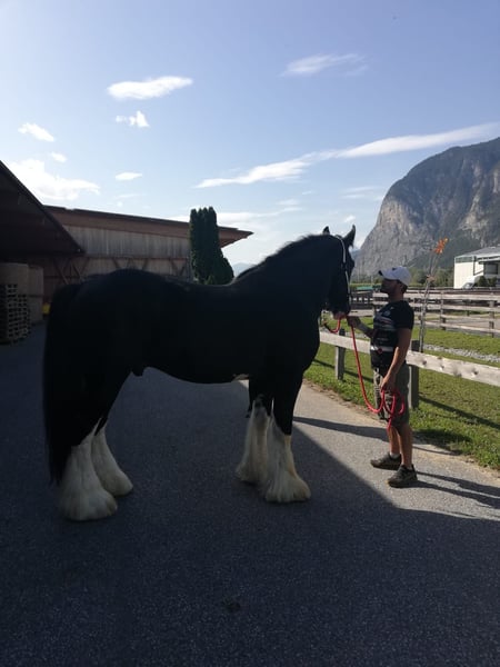 Thank you for your interest in our Shire Horse stallion Rookhills Black Prince, also known as "Marley." With Marley, one of our most beautiful and beloved stallions is now for sale. After deciding to continue our breeding line with our home-bred stallion, it is now time to find a beautiful new home for Marley, as he truly deserves it. Marley was born in 2008 and impresses – besides his absolutely imposing appearance – primarily with his sweet and uncomplicated nature. He is a reliable horse both on the ground and under saddle. Marley particularly loves long rides. He goes out bravely alone into the terrain, but he can also be accompanied by another horse as long as it is not a Shire Horse mare. Because then he wants to fulfill his "job" as a breeding stallion. Marley is a licensed breeding stallion for life. We have found that he is not interested in mares of other breeds. Marley also shows talent in the arena and enjoys any activity, whether it be groundwork or walks. The main thing is that there are cuddles afterwards. Marley is uncomplicated and experienced in all respects. Farrier, veterinarian, trailer loading – no problem for Marley. Marley will only be placed with people who can dedicate a lot of time to him and where he comes first. Therefore, the price is negotiable – in any case, placement is prioritized over price. This advertisement is also aimed at people with less than the listed budget, who can take the time for him and provide him with a beautiful retirement. In principle, Marley can continue to be used as a breeding stallion, as he is a licensed stallion for life. However, we wish for him a place where he can find peace. Therefore, the price is also negotiable. If you are looking for a stunning Shire Horse with a gentle and people-oriented character, with whom you can escape the everyday routine together, please feel free to contact us. Our animals are only placed in the best hands and in an age-appropriate home, so it is important to us to take sufficient time for interested parties. It is also important to us that the horse has a say in the decision, as the chemistry must also be right for our animals. Marley lives near Bad Füssing, and we would be happy to send the exact address upon arranging an appointment. We will also be offering guided rides and hikes with our gentle giants in beautiful nature again starting in the autumn. Less experienced riders are also welcome to join; in this case, the horse will be led from the ground. Vouchers for this are also available from us and have already provided many lovely (birthday) surprises. Further impressions of our horses can also be found on our WhatsApp channel. If interested, we would be happy to send the link. We look forward to your message.