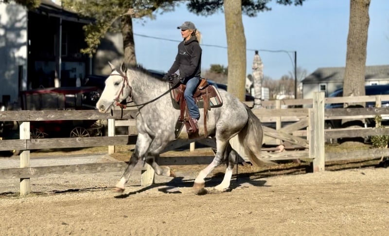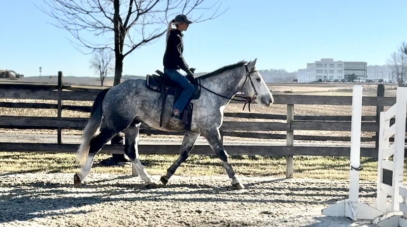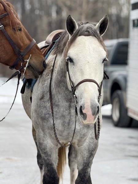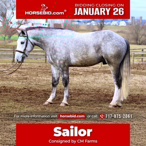 𝐉𝐀𝐍𝐔𝐀𝐑𝐘 ⭐️𝑨𝒍𝒍 𝑺𝒕𝒂𝒓 𝑳𝒊𝒏𝒆𝒖𝒑⭐️ Happening now thru MONDAY | JANUARY 26th - Available EXCLUSIVELY on HorseBid's website! For more details and to register visit: www.Horsebid.com CONSIGNOR CONTACT: CM Farms 717-875-2061 LOCATION: Gap, PA BREED: Shire/QHX REGISTERED: No REGISTERED NAME: Sailor COLOR: Grey HEIGHT: 15.3-16 AGE: 5 GENDER: Gelding Meet Sailor! This perfectly put-together guy is a 5-year-old Shire/QH cross gelding. He stands right around 15.3–16 hands high with a solid build, making him suitable to carry a variety of riders. Not only is Sailor good-looking, he has all the right qualities to match. His temperament is unbeatable! He was born quiet, is easygoing and unflappable, and he LOVES people. This special guy has absolutely stolen our hearts—it’s impossible not to love him! He’s like a big teddy bear and is enjoyable both in the barn and under saddle in every way. He rides English, Western, bareback, and he’s broke to drive! If you’ve been looking for a horse to learn on, grow with, and call your best friend—here he is. Under saddle, Sailor is one of the easiest horses we’ve ever had. He is the same horse whether he’s ridden every day or pulled out once a month. He’s the reliable kind that’s hard to come by, and once you find one, you never want to part with him! This perfect boy is well balanced and has a sensible brain—he’s wise beyond his age. His trot is even, adjustable, and easy to sit. True to his quiet personality, he tends to be more of a push ride and is not one that will run away with you. He is still responsive and will move out when asked. His canter is incredibly smooth, with both leads, easy transitions, and zero funny business. He would make a fun dressage prospect—his balance, ability to adjust himself, and pretty movement get noticed by everyone. He knows how to leg yield, side-pass, and spin! He’s the kind of horse you don’t have to worry about; he can handle mistakes and won’t hold them against you. You’ll finish every ride with a smile on Sailor boy—he’s truly special and is going to make someone very happy. Sailor keeps his head on his shoulders in every situation, which also makes him an incredible trail partner. He is brave and genuinely enjoys spending time on the trail. He’s happy to mosey along in the back and pack the husband, or he’ll lead the pack cantering through the fields. He’s been on roads, in windy woods, through water and creeks, and out in open fields—he’s seen it all and acts like a 30-year-old pack horse. Bikers, traffic, hikers, flags, dogs, wildlife—he’ll shrug and carry on doing his thing. Sailor has had plenty of saddle time both Western and English, and he looks equally good in both. He’s the type of horse you could ride with your eyes closed and he’ll take care of the rest. We’re pretty confident that any idiot who can climb on can ride him. He’s solid, sweet, and reliable. It’s hard to put into words just how special this boy is! In the barn, Sailor will greet you every time with ears forward and a sweet expression. He has the softest eye, which truly shows his genuine soul. He’s a people-lover and will stand on the cross-ties all day just to be loved on. He enjoys his people, his snacks, and any attention he can get. He’ll greet you in the pasture and gets along well with everyone for turnout. He’s quiet and well-behaved in his stall, with zero vices, and is an easy keeper. He loads and unloads from the trailer like an old pro and is enjoyable and easy to have around in every aspect. Sailor is a lovely young prospect—safe, stress-free, and a good boy with his whole life ahead of him. We will definitely be sad to see this gelding go, but excited to watch all the great things he will do. Don’t miss your chance to own this special boy!