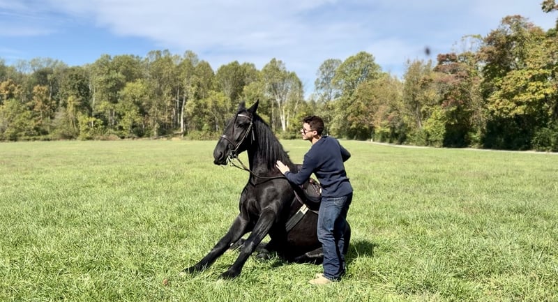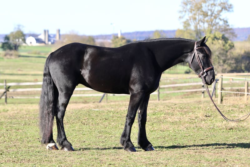 🎲𝓽𝓱𝓮 𝐑𝐈𝐃𝐄𝐑'𝐒 𝓒𝓱𝓸𝓲𝓬𝓮🎲 Happening now thru MONDAY | NOVEMBER 17th - Available EXCLUSIVELY on HorseBid's website! For more details and to register visit: www.Horsebid.com CONSIGNOR CONTACT: CM Farms 717-875-2061 LOCATION: Gap, PA BREED: Shire/Friesian/QHx REGISTERED: No REGISTERED NAME: Montgomery COLOR: Black HEIGHT: 16.2 AGE: 4 GENDER: Gelding Meet ✨Montgomery✨ a four year-old, 16.2 hand, Shire/Friesian/QH cross gelding. This well put together man has the sweetest temperament and has quickly made himself a barn favorite! Monty is also interchangeably known as Whiskers and Mustache around our barn. No, seriously- he probably has a better mustache than most of the men in your life…😂 -And while the mustache definitely makes him stand out, his overall sweet demeanor, safe mind, and talent under saddle and harness is what truly makes him stand out. He is wise beyond his years and was simply born quiet. He rides both Western and English, and drives both single and double. This boy even knows some tricks; he will lay down and sit like a dog on command! Monty has been started slowly and correctly under saddle. Exposed to a variety of different environments and disciplines, without anything being drilled or overdone. He is smart, athletic, a nice mover, and he can continue to go any direction and succeed. When people talk about wanting the perfect “in-between” draft cross that can still be athletic while having substance- this guy is what they’re describing. He’s sturdy, sure footed, a floaty mover, and a comfortable ride! He’s been on many trail rides to ensure a good foundation to his education. We would argue that he is already quite the trail master! He just tackled a hunter pace last weekend, and we couldn’t have asked him to do a better job. You can put him anywhere in the group and he’ll happily go along on a loose rein. He is very courageous and will lead even better than some of the older horses! He has a calm, quiet personality, and has proven to be incredibly brave. Monty has flown through our desensitization program like it was a breeze. He doesn’t mind the tarp, flag, smoke, equipment, traffic, dogs (and other various animals)- and he’s even walked through fire without batting an eye. You can ride him right to town without having a worry in the world. He’s even gone through the Chipotle drive-thru to pick up lunch! Monty is quite the guy, and once he gets to know you, he will be your best friend. He’s the type of horse that will bond with you, and once you have his trust, he will do anything for you! All it takes to win Monty over is a handful of treats and a soft gentle touch. He is a sensitive soul that is a once in a lifetime horse. In the ring, Monty has a nice walk trot and canter both directions. He’s responsive, forward thinking and a quick learner. You never have to ask him twice. His trot is adjustable. He moves off of leg, and he’s just starting to learn going on the bit and doing more collection work. His transitions are coming along incredibly well, and he has the best brakes with just a “whoa” or a sit back. He neck reins and direct reins, and once you get done riding and hop off of him, he will follow you around like a puppy- no lead rope needed! This superstar has been lightly started over jumps, both in the ring and cross country. He even did some coops on the pace! He is so naturally talented with his form, technique, and spatial awareness. He has the cutest knees over jumps (seriously look at the pictures) and endless scope! He doesn’t get rushy or hot. You can jump around, and then come back down and walk on a loose rein. If someone continues him in this direction, the options are endless! In the barn, Monty is always respectful and easy to handle. He stands on the cross ties or straight tie and will stand as still as a statue as long as you want him to. He’s quiet to both groom and tack up, and seems to love the attention. He’s behaved in his stall and for the vet and farrier. He loads right into the trailer and turns out in a mixed herd. We all adore our mustache around here--and we want the best home for him. If it weren’t for a full barn and an already large collection of personal horses, Caleb has sworn he’d be keeping him for himself! If you’re looking for a young prospect with zero vices, a sound mind, and the ability to go any direction do not pass up on this special gelding. UTD on shots farrier dentist and coggins- PPEs welcome