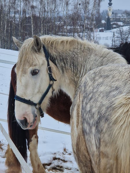 Unser verschmuster Shire Horse Wallach Nepomuk sucht ein neues Traumzuhause. Nepomuk ist im August 2020 geboren und entstammt unserer eigenen Zucht. Aktuell hat er ein Stockmaß von 1,75 Meter wobei er aller Voraussicht nach noch ein paar Zentimeter wachsen wird. Er ist seit seiner Geburt immer in unserem Besitz und ist nun bereit für einen Lebensplatz bei lieben Menschen die ihn adäquat fördern möchten und Zeit mit einem lieben Pferd verbringen möchten. . Leider hat Nepomuk im vergangenen Jahr erstmalig Anzeichen eines Sommerekzems gezeigt, das sich jedoch durch Eindecken und entsprechende Pflege sehr gut in Schach halten lässt. Aufgrund dieser Thematik wird Nepomuk weit unter seinem eigentlichen Wert abgegeben – statt 11'500 € liegt der Preis nun bei 7'200 €. Wir suchen für ihn einen Platz bei Menschen, die bereit sind, in den Sommermonaten ein paar Pflegeeinheiten mehr zu investieren (insbesondere regelmäßiges Eindecken), um im Gegenzug einen wirklich dankbaren, ehrlichen und wunderbaren Shire Horse Wallach an ihrer Seite zu haben. Aufgewachsen ist Nepomuk bis zum Beginn seiner Ausbildung übrigens in Offenstallhaltung gemeinsam mit Artgenossen unterschiedlichen Alters. Aktuell ist Nepomuk wieder im Beritt, dort kann man ihn mit Terminvereinbarung jederzeit besichtigen und auch ein Probereiten vereinbart werden. Davor hat Nepomuk Urlaub auf einer weitläufigen Sommerweide in Oberösterreich gemacht und genoss die Zeit zwischen anderen Stuten und Wallachen. Er zeigt sich bislang als ausgesprochen unkompliziert im Verhalten mit anderen Pferden, auch mit unseren Hengsten hat er sich sehr gut verstanden. Wir würden ihn also als rundum in der Herde „sozial kompatibel“ bezeichnen. Wie bereits oben erwähnt haben wir vor Kurzem wieder mit dem Beritt von Nepomuk begonnen. Hier zeigt er sich vorsichtig aber motiviert, freundlich und sozial als ein guter Schüler. Wir stehen auf Grund seines Alters jedoch erst am Beginn seiner Ausbildung, Shire Horses wachsen bis zu einem Alter von 8 Jahren, wir nehmen daher besondere Rücksicht auf einen schonenden Beritt. Nepomuk ist umgänglich und unkompliziert . Wenn ihn was nervös macht wie ein wilder Sturm , muss man einfach nur ruhig und geduldig bleiben. Hektik mag er gar nicht. Im Moment testet er gerne bzw. fragt auch mal nach (niemals bösartig oder nicht mehr händelbar), deshalb möchten wir ihn gerne in erfahrenere Hände geben, damit die Freunde an und mit ihm lange anhält. Als Reitpferd steht er wie beschrieben noch am Beginn seiner Ausbildung. Er kennt mittlerweile den Reiter auf seinem Rücken und die 3 Grundgangarten und wurde auch als Handpferd ins Gelände mitgenommen, was ihm viel Freude bereitet. Bei adäquater Förderung ist hier bestimmt noch einiges mit ihm möglich. Nepomuk verfügt über volle Papiere der englischen Shire Horse Society. Selbstverständlich wird Nepomuk regelmäßig geimpft, entwurmt und dem Hufschmied vorgestellt wobei er sich immer zu benehmen weiß. Aktuell läuft er barhuf und kommt damit gut zurecht. Auch Hängerfahren ist kein Problem. .