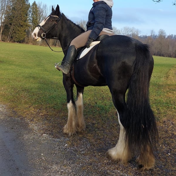 Auf diesem Weg sucht eines unserer wunderbarsten Reitpferde ihr neues Traumzuhause. Stella hat schon viele unserer Ausritte zuverlässig begleitet. Auch Reitanfängern vermittelt Stelle ein rundum sicheres Gefühl, egal ob auf dem Platz oder im Gelände. Zudem können wir sie uns absolut als Therapiepferd vorstellen. In den Vergangenen Monaten hat sich gezeigt, dass Stella in Offenstallhaltung langfristig nicht glücklich ist. Zwar ist sie absolut verträglich mit anderen Pferden und krault auch gerne jedoch möchte sie einfach ihren eigenen Bereich haben in dem sie ungestört fressen und zur Ruhe kommen darf. Wir haben uns daher entschieden, Stella einen Lebensplatz bei Menschen zu suchen, welche ihr einen (Paddock)Boxenplatz verbunden mit viel Zeit und Liebe schenken möchten. Im Gegenzug erhält man mit Stella eine wunderbare Lehrmeisterin und zuverlässige Partnerin. Leider leidet Stella seit drei Jahren an einem Sommerekzem, weshalb sie in den Sommermonaten eingedeckt werden muss. Ihre passende Decke bringt sie selbstverständlich mit. Mit etwas zusätzlicher Pflege und Aufmerksamkeit lässt sich das Ekzem sehr gut managen. Aufgrund dessen haben wir den Preis von ursprünglich 8.800 € auf 3.900 € reduziert – uns ist vor allem wichtig, dass Stella in ein passendes und liebevolles Zuhause kommt. Stella verfügt über volle Papiere der englischen Shire Horse Society. Stella ist aktuell vorne beschlagen da wir viel im steinigen Gelände mit ihr unterwegs sind. Sie ist artig und lieb beim Hufschmied. Auch Hängerfahren ist kein Problem für Stella, egal ob mit oder ohne Begleitung. Unsere Tiere werden nur in beste Hände und ein altersentsprechendes Zuhause abgegeben daher ist es uns wichtig, uns ausreichend Zeit für InteressentInnen zu nehmen. Auch ist es uns wichtig dass das Pferd mitentscheidet, denn auch für unsere Tiere muss die Chemie stimmen. Nachdem es uns besonders wichtig ist, ein schönes Zuhause für Stella zu finden, ist der Preis verhandelbar. Es gilt jedenfalls Platz vor Preis, wir freuen uns daher über eine Beschreibung des geplanten Zuhauses. Stella steht in der Nähe von Ried im Innkreis, die genaue Adresse geben wir nach Terminvereinbarung gerne bekannt. Weitere Eindrücke von unseren Pferden sind auch gerne auf unserem Whatsapp-Kanal zu finden. Bei Interesse senden wir den Link hierzu sehr gerne zu. Wir freuen uns über eine Nachricht für Stella.