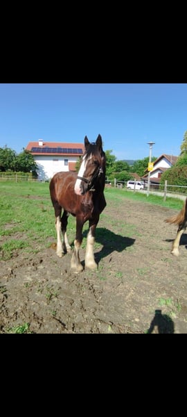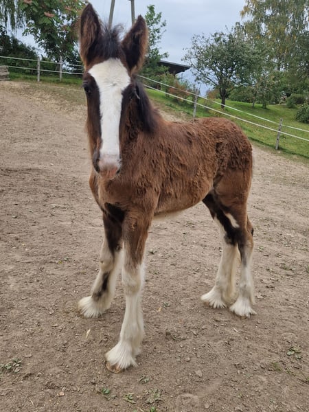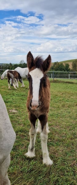 Thank you for your interest in our Shire Horse filly Eve. Eve was born in the summer of 2023 and will soon be able to move into a species-appropriate, new home with a horse company. Her teddy bear look is particularly striking, which has earned her the nickname "Flauschi". Eve grows up in a herd and spends a lot of time with her playmates every day. She is very people-oriented and sweet to deal with, loves long strokes and is always curious and playful. But she also likes to test. She knows the halter and can already be led well. Of course, she will be dewormed regularly and provided with all the necessary vaccinations at the time of delivery. Eve also coped well with the first farrier visits. Both parents can be viewed on our farm. If you are looking for a Shire Horse with a gentle and people-oriented character, which you would like to lovingly accompany to your life as a partner at your side, please contact us, preferably via whatsapp. Our animals are only given into the best hands and an age-appropriate home, so it is important to us to take enough time for interested parties. We look forward to hearing from Eve.